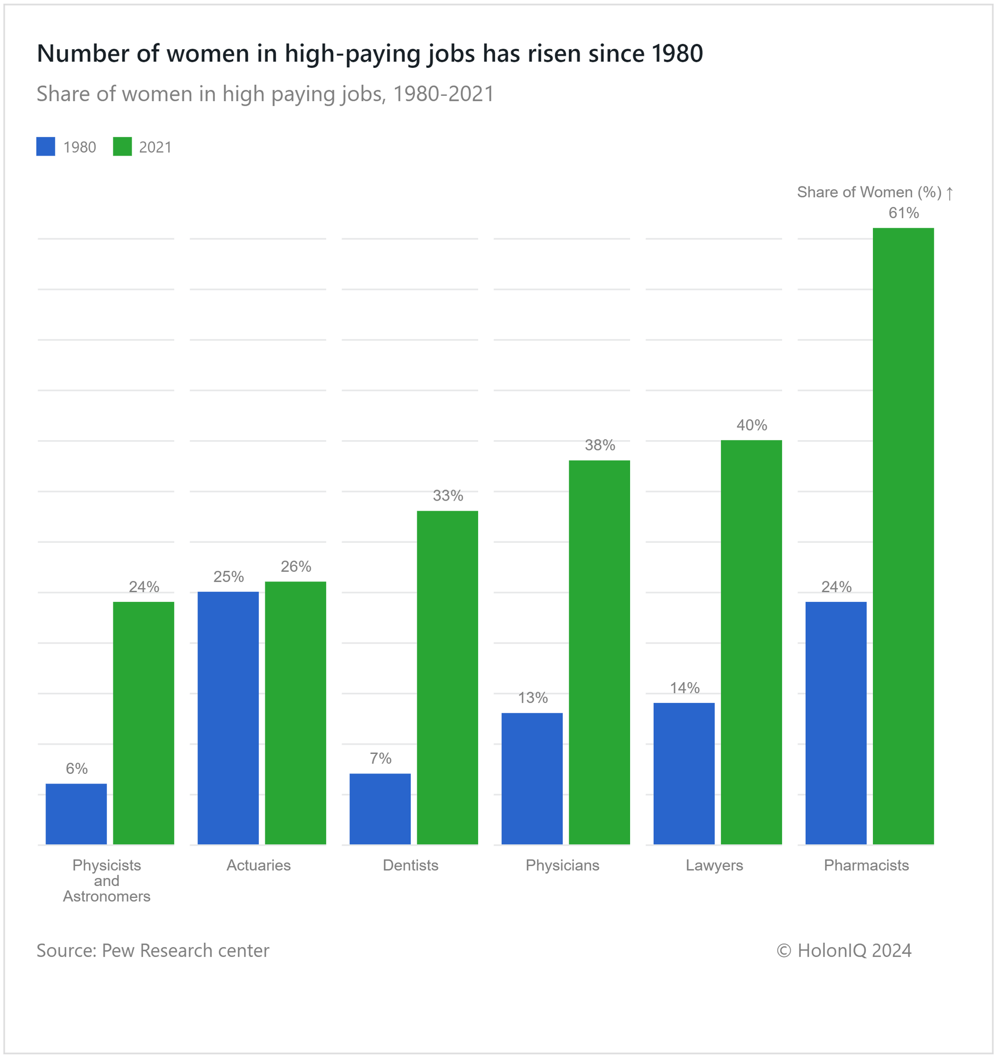 The increase in educational attainment has helped to catalyze a significant shift in the distribution of women across high-paying jobs. This transformative trend is particularly evident in roles in healthcare, such as pharmacists, physicians, and dentists. Since 1980, there has been a remarkable increase in the number of women entering these fields, showcasing the growing opportunities for women in sectors that traditionally had lower participation. Notably, the occupation of pharmacists stands out, with a participation rate reaching 61% as of 2021โthree times higher than the 24% recorded in 1980.