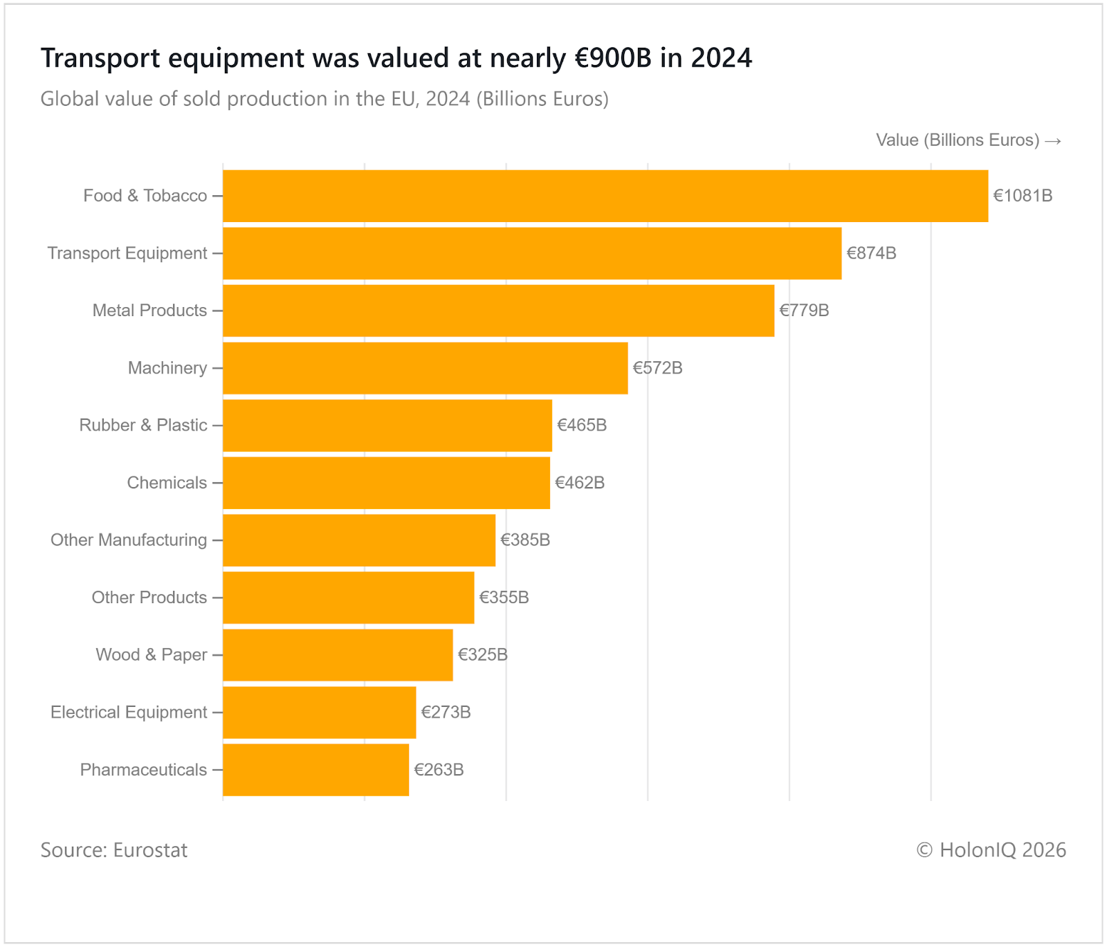 In 2024, transport equipment had nearly โฌ900B in sold production, second only to food and tobacco. High demand for cars, trucks, and aerospace components across Europe and globally drives this sector. Strong industrial clusters in Germany, France, and Italy, along with exports and technological innovation, support growth. Other sectors, such as food, metal products, and machinery, follow, but transport remains the backbone of EU manufacturing, highlighting its strategic role in trade, employment, and advanced industrial capabilities.