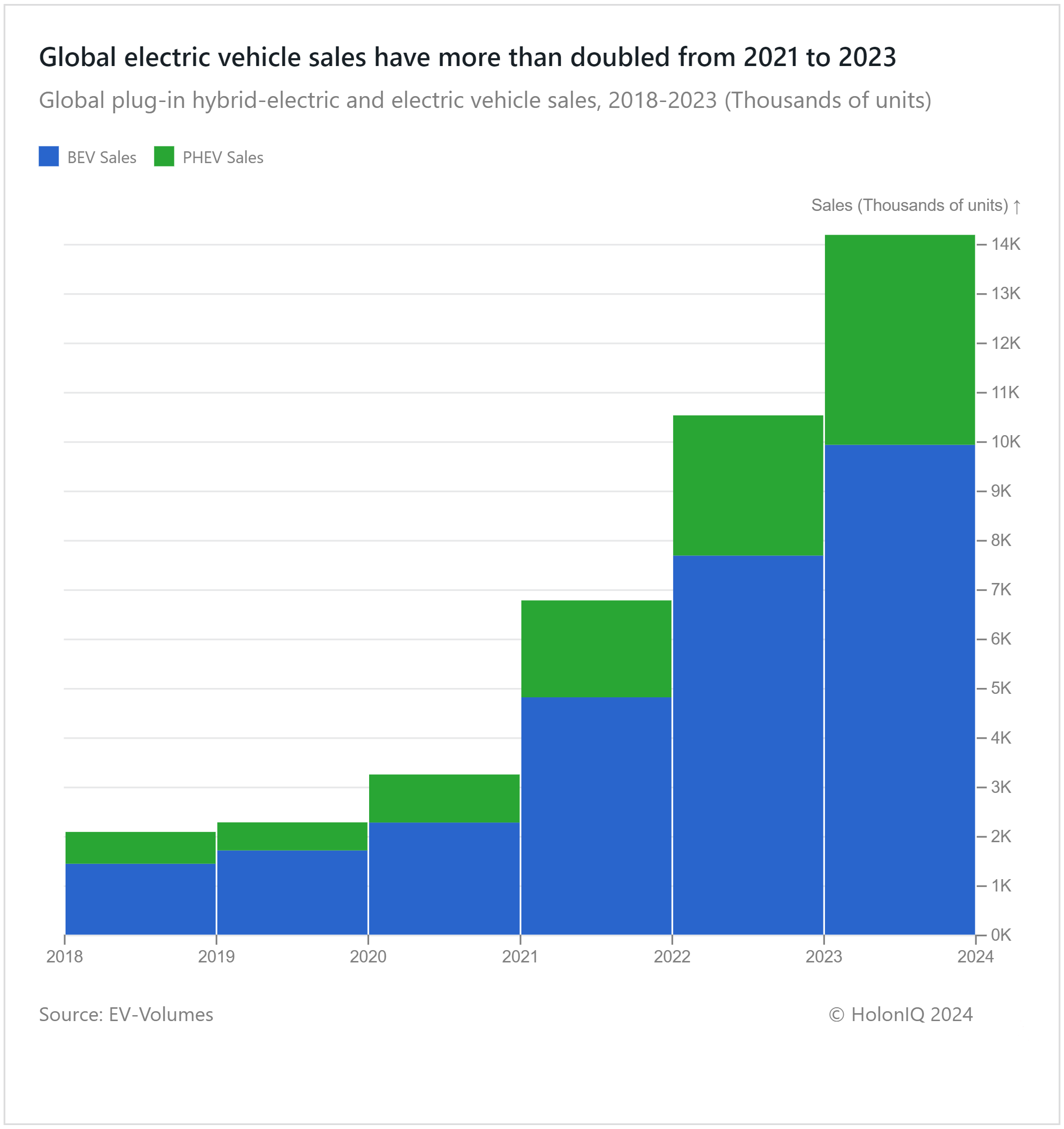 At the end of 2023, global EV sales reached 14 million units, up from approximately 2,000 units in 2018. Advancements in technologies around EVs and batteries, favorable government policies such as tax breaks and subsidies, growing consumer sentiment on climate change, and established automakers joining the fray have propelled EV sales by approximately 500% over the last five years. While this growth was predominantly led by battery electric vehicles, throughout 2023, plug-in-hybrids (PHEVs) accounted for a larger share in EV sales in comparison to previous years. In 2023, sales of PHEVs recorded a 50% increase in comparison to 2022. This is largely due to the inherent advantage that they offer over battery-electric vehicles, which can run on the battery as well as on the combustion engine. The current limitations of battery technology and charging infrastructure are barriers to pure EV adoption, and thus, PHEVs will play a vital role in driving EV growth in 2024.