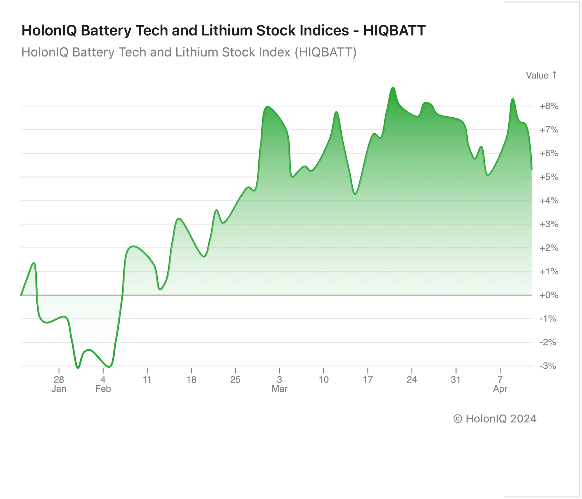 π Battery Tech and Lithium Index. Index up 4% as increasing demand for plug-in-hybrids and energy storage solutions counter the slump