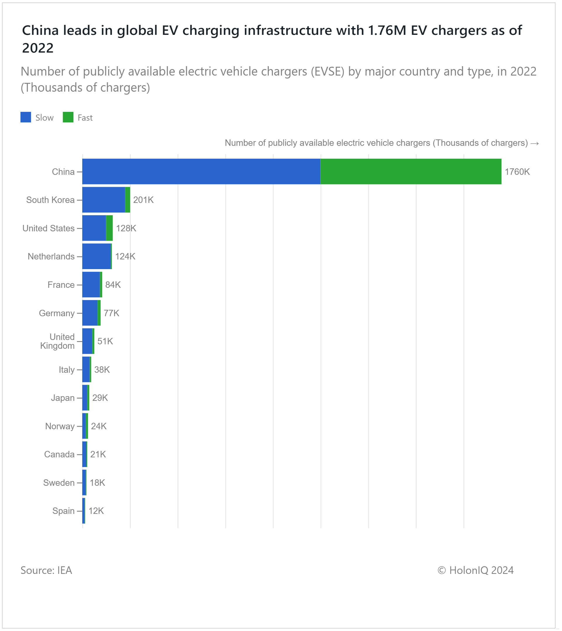 It is not surprising that China leads the world in the number of installed EV chargers, given that China is the single largest EV market and the largest producer of EV batteries. In 2023, Chinese EV sales expanded by 38% to 9.49 million units, accounting for 31% of its domestic new car sales. Demand for plug-in hybrids rose 85% to 2.80 million units. In comparison, battery electric vehicle sales grew by 25% to 6.68 million units. China is ahead of Europe and North America in terms of rolling out charging infrastructure along with EV adoption, while Europe lags behind despite being the second-largest EV market. The availability of charging infrastructure is one of the factors holding back wider EV adoption globally.