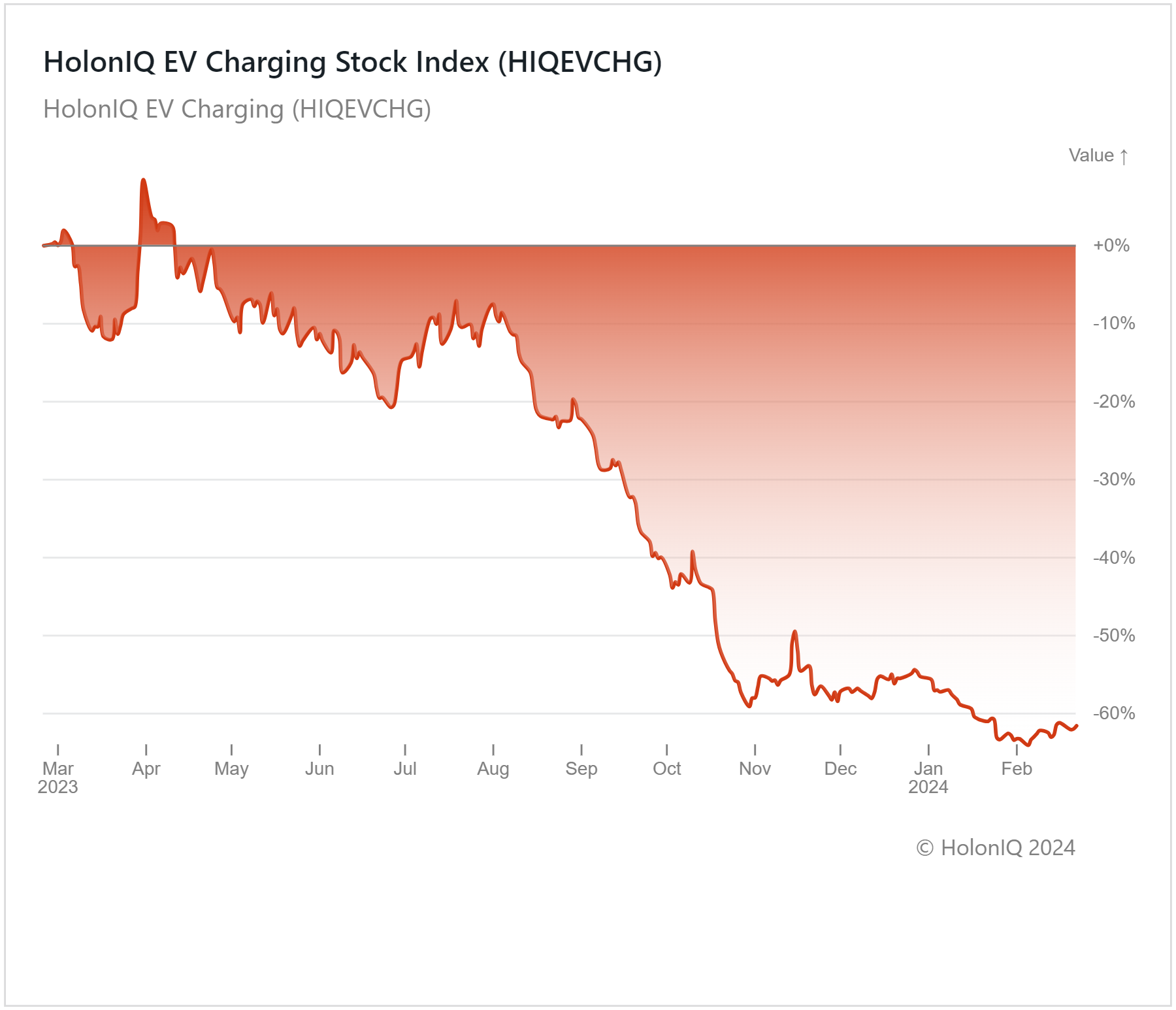 Holon IQβs EV Charging Index fell by over 60% in the past year as major stocks in the index registered significant declines. ChargePoint Holdings (MCap: $970M), Tesla (MCap: $628B), and BYD (MCap: $72B) all decreased, weighing down on the index. An exception was ABB Ltd. (MCap: $82B), which saw significant gains over the last 12 months.
