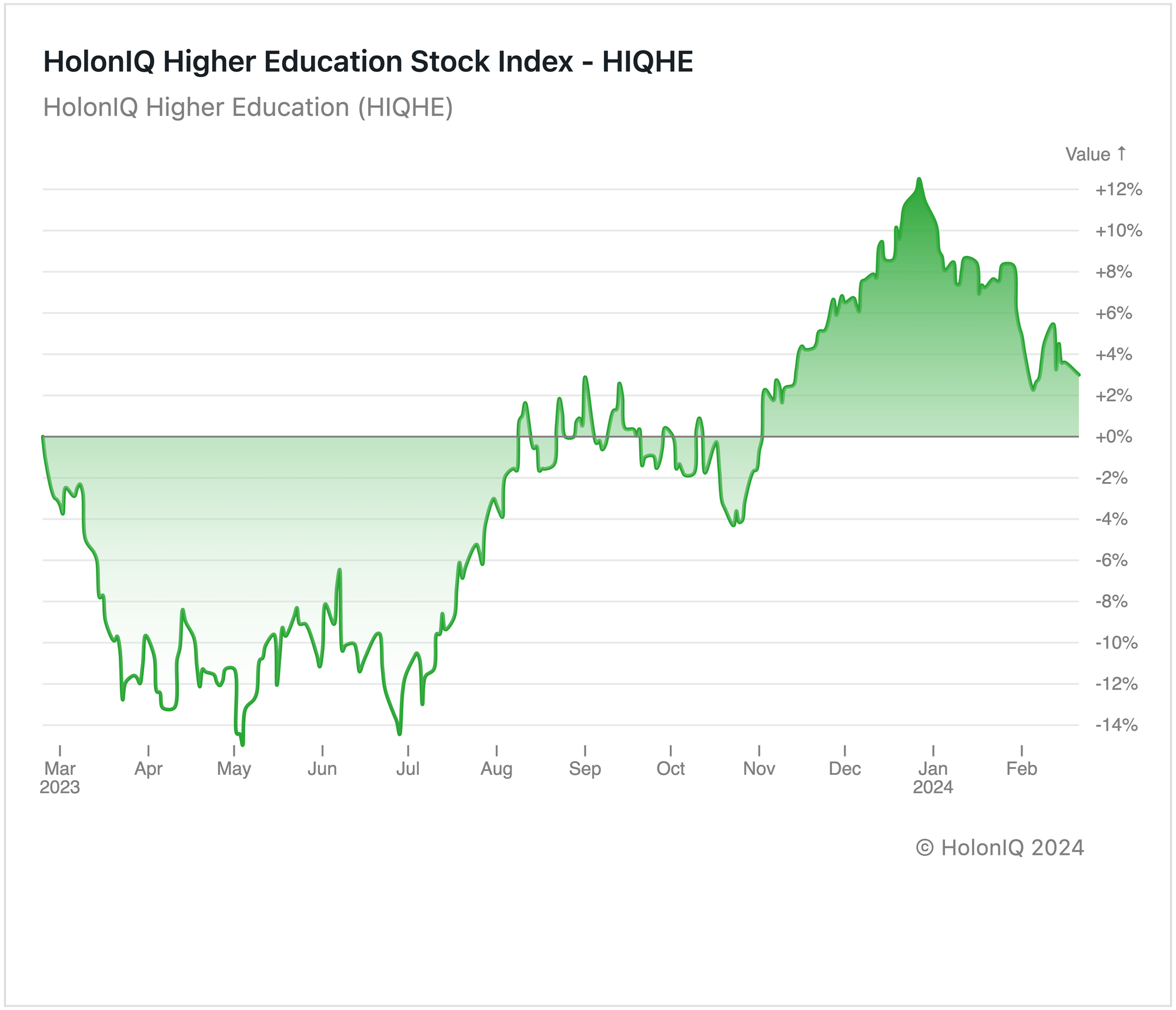 The Higher Education index recovered from a 16% decline in 2H23 to a record a slight uptick in February 2024, with strong performances from several stocks within the group. Despite labor market challenges and economic uncertainty, academic institutions are restructuring their strategies to integrate online programs into their services, while competency-based learning and apprenticeship models are also gaining momentum.