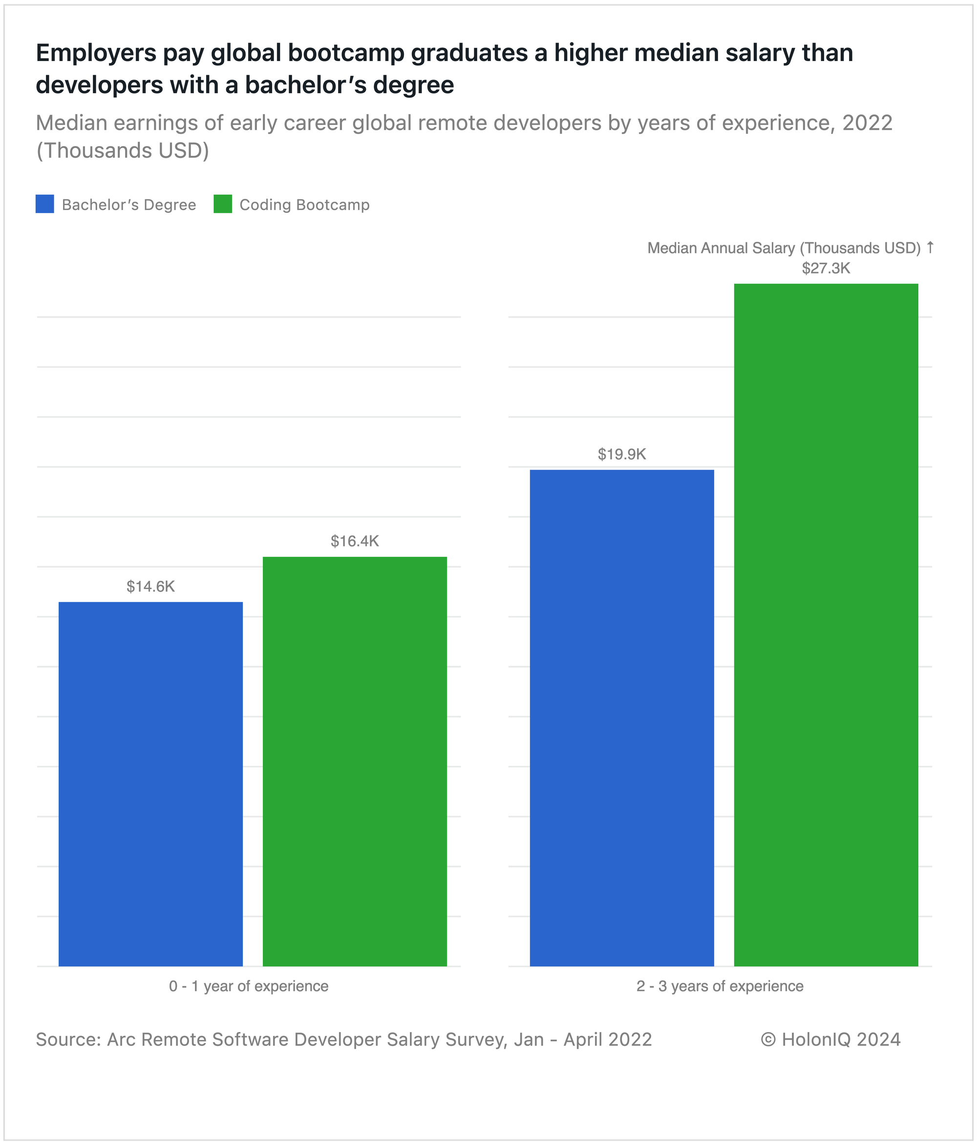 A survey of 2,504 remote developers reveals that coding bootcamp graduates earn higher starting salaries than those with bachelorโs degrees, indicating a shift in employer attitudes favoring work-ready skills over formal qualifications for early career workers.