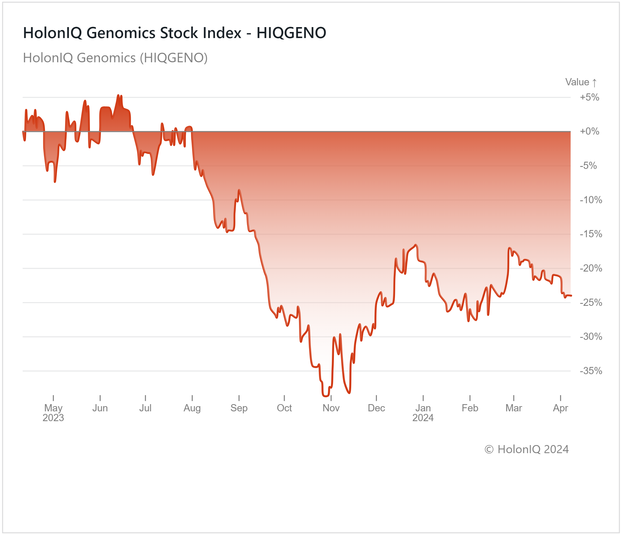 The HolonIQ Genomics index fell by around 25% year-over-year in the broader portfolio. Major constituents QIAGEN, Illumina, and BioMarin all saw notable drops. Pandemic disruptions and recession fears impacted market performance. However, new treatment approvals since November, including Orchard Therapeutics' Lenmeldy gene therapy, signal a more positive outlook, with advancements in cell therapy and DNA storage standardization by The DNA Data Storage Alliance offering further promise. FDA approvals like Lenmeldy bode well, but high costs currently limit patient access. Expanded coverage for these treatments could ease access barriers and solidify genomics' role in healthcare.