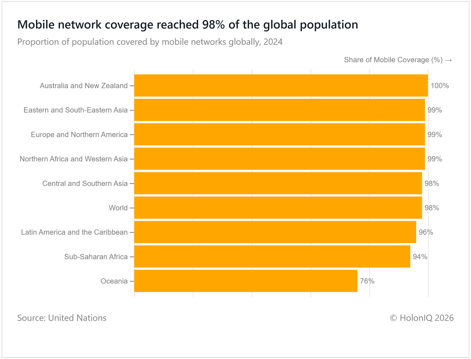 Mobile network coverage approached universality in 2024, with global access near 100% and many regions at or close to full coverage. This reflects how mobile connectivity has become a basic infrastructure rather than a premium service. In lower income countries, affordability has been enabled by low cost mobile technologies, and private sector investment supported by public regulation. Universal access goals under the UN Sustainable Development Goals continue to prioritise mobile networks as a foundation for digital inclusion and service delivery.
