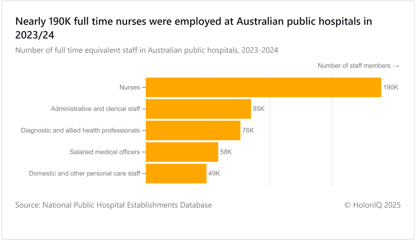 Nearly 190K full-time nurses staffed Australian public hospitals in 2023/24, yet the healthcare system faced severe constraints in workforce due, driven by aging population, burnout, and post-COVID attrition. Government initiatives for replenishment include Primary Care Nursing Scholarship Program offering 500 annual scholarships for nurse practitioner/midwife training, financial incentives of up to $70K for rural Queensland positions and $20K for NSW relocation, and Victoria's scholarships. The National Nursing Workforce Strategy emphasizes international recruitment, scope-of-practice reforms, and rural placement programs to replenish shortages.