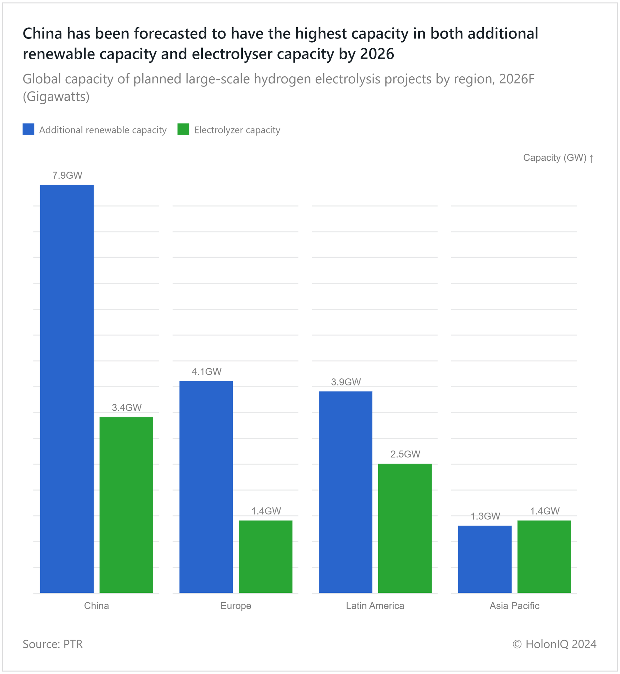 Green Hydrogen, produced from renewable energy is considered to be the fuel of the future, with carbon emissions decreased across the entire value chain. In alignment with global pledges to meet net zero, the production of hydrogen from unabated fossil fuels is expected to decrease leading up to 2050. As the global electrolyzer capacity along with the global renewable energy capacity increases, the ability to scale up the production of green hydrogen increases exponentially. Currently, as is the case with most clean energy hardware, China has an indomitable hold on the market. The country's renewable capacity dwarfs the rest of the world and over the last few years, they have been ramping up electrolyzer capacity as well.