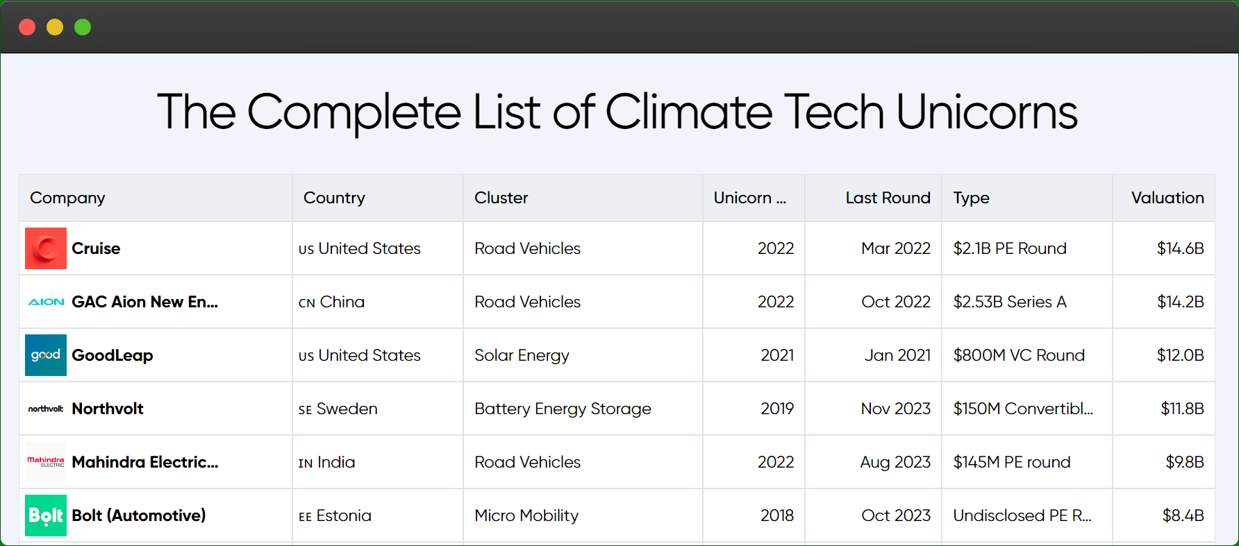 🦄 2024 Global Climate Tech Unicorn List