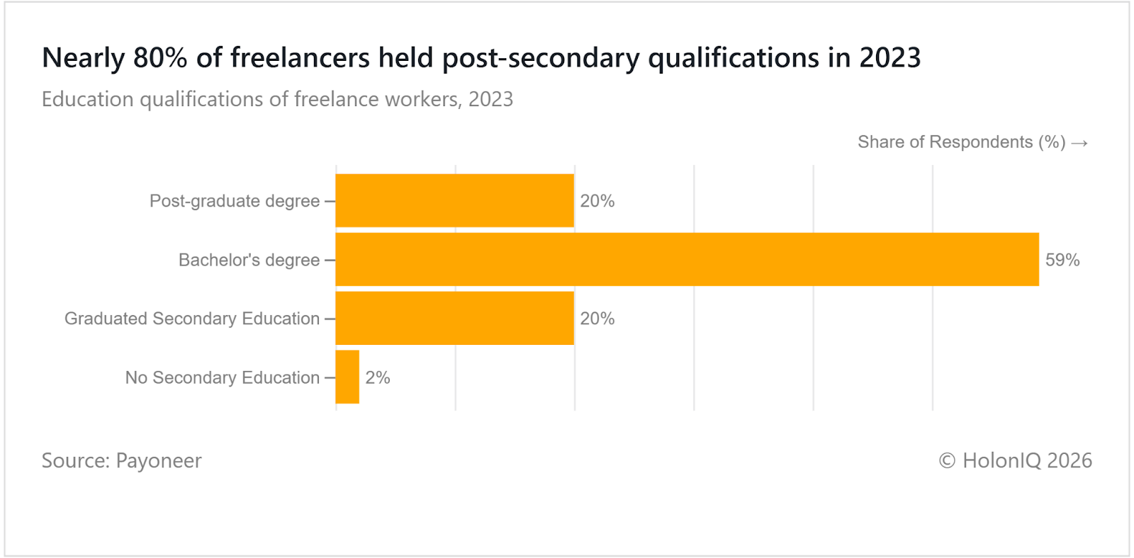 In 2023, nearly 80% of freelance workers held a bachelorβs or postgraduate degree, signalling that highly educated professionals are increasingly choosing freelancing for flexibility, autonomy, as a side hustle and access to global demand for specialised skills. This also portrays a shift away from graduates choosing more traditional forms of employment. However, the intense competition within the job market, which has created a lack of jobs, has also fueled this shift. Digital platforms such as Upwork and Fiverr have contributed to remote work normalisation. The industry still faces challenges in replicating long term employee security, employment benefit distribution and job security, and oversupply for a limited demand.