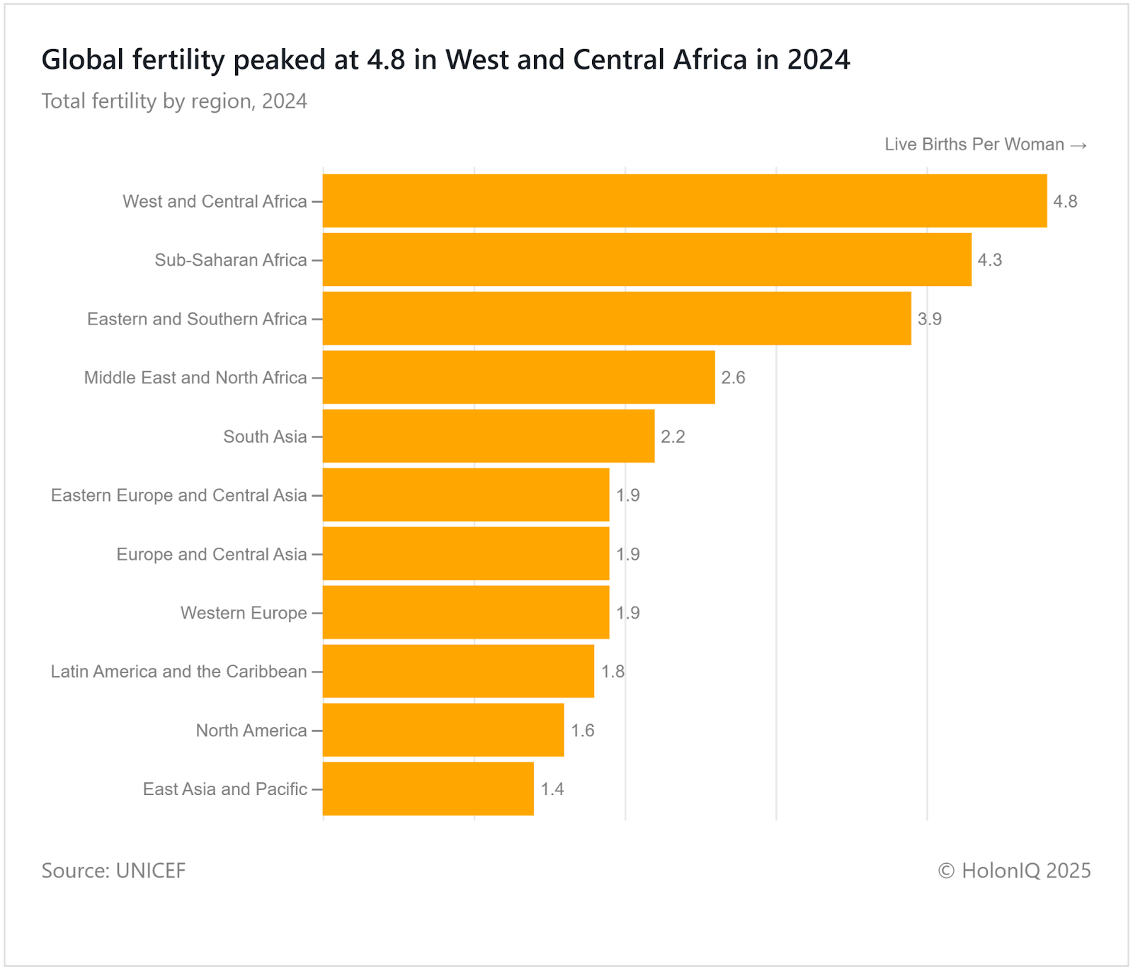 Total fertility rates in 2024 show sharp regional contrasts, from 1.4 births per woman in East Asia and Pacific to a peak of 4.8 in West and Central Africa. Africaβs higher fertility reflects a combination of limited access to reproductive health services, lower female educational attainment, higher child mortality, and the economic value of larger households in agrarian economies. These factors sustain rapid population growth, intensifying pressure on early childhood education, health systems, and social services. UNICEFβs Early Childhood Development programmes target these structural drivers by expanding maternal health, nutrition, and preschool access.