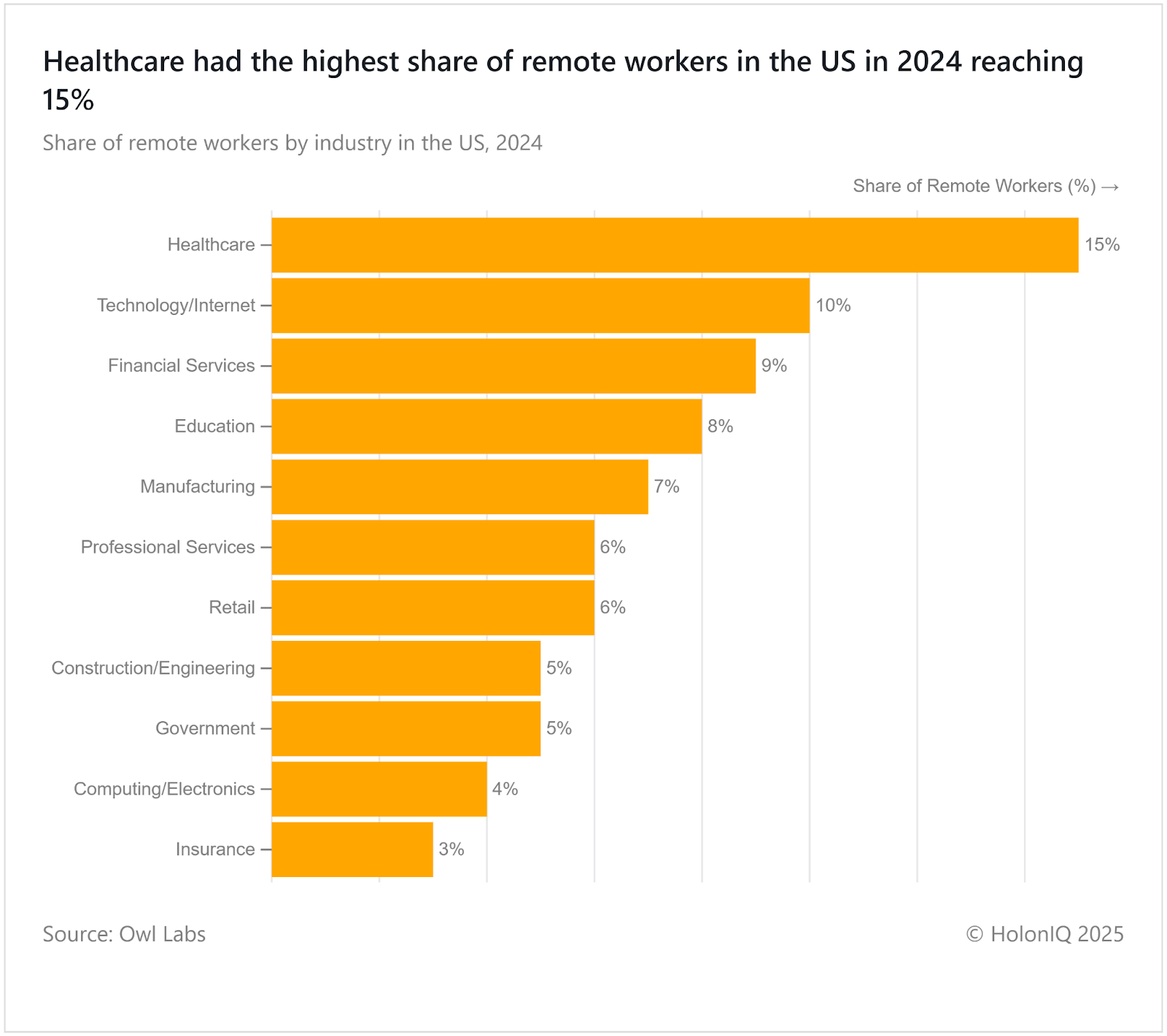 Healthcare accounted for the largest share of remote workers in the US in 2024, at 15%. Persistent burnout and staffing shortages across the US healthcare system have driven health systems to adopt remote work as a practical solution to retain experienced nurses and administrative staff while reducing costs. Large healthcare systems are using virtual nursing to split clinical workloads. Policy support, including CMSβs Virtual Direct Supervision rule, further enables remote oversight, highlighting how the US is promoting remote work to address healthcare workforce shortages.