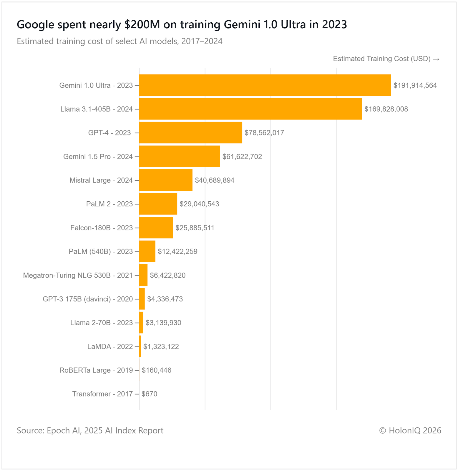 Google spent over $190M training Gemini 1.0 Ultra in 2023, reflecting the escalated training costs, from a mere $670 on Transformer in 2017 to $78M on GPT-4 and $191M on Gemini Ultra. Costs have continued to grow annually, driven by growing compute demands and scaling laws requiring larger models. Extended big company partnerships created tight-knit ecosystems. Microsoft invested $13B in OpenAI while partnering with Meta for Llama, and OpenAI secured deals with Oracle ($300B). However, concerns about an AI investment bubble are intensified as circular investments such as Nvidia-OpenAI-CoreWeave loops, OpenAI's $1T commitments against $4.3B revenue, and debt-financed data centers potentially raise concerns of ROIs and over-reliance on AI.