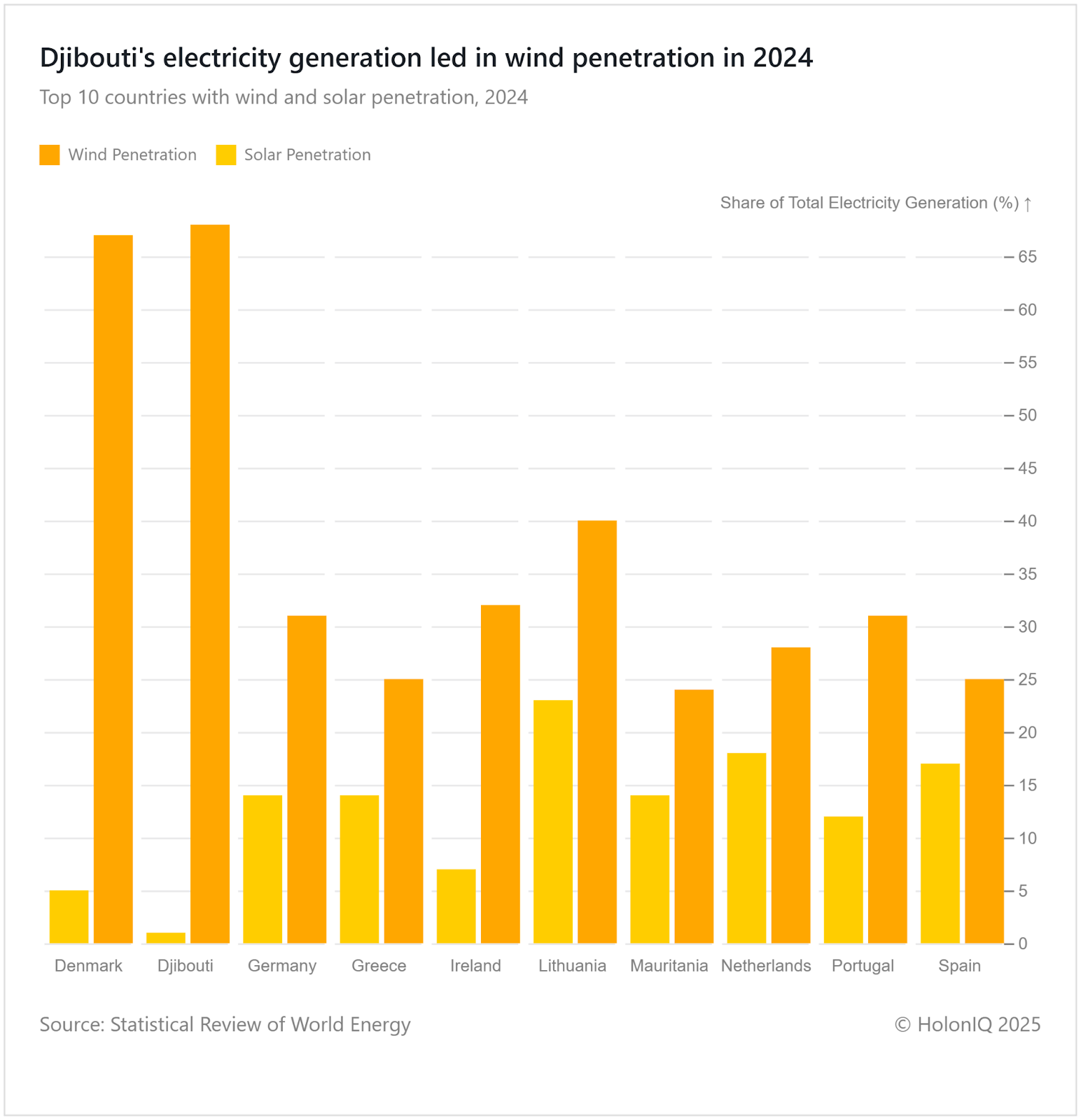 Djibouti ranks first globally in wind penetration, with wind energy alone supplying 68% of its power in 2024. This reflects the country’s strategic investment in harnessing the strong Red Sea winds to reduce reliance on imported fossil fuels. Djibouti’s renewable progress mirrors broader African ambitions for clean energy independence. Supported by initiatives under the Africa Renewable Energy Initiative (AREI), such projects aim to strengthen sustainable infrastructure and expand access to affordable, low carbon electricity.