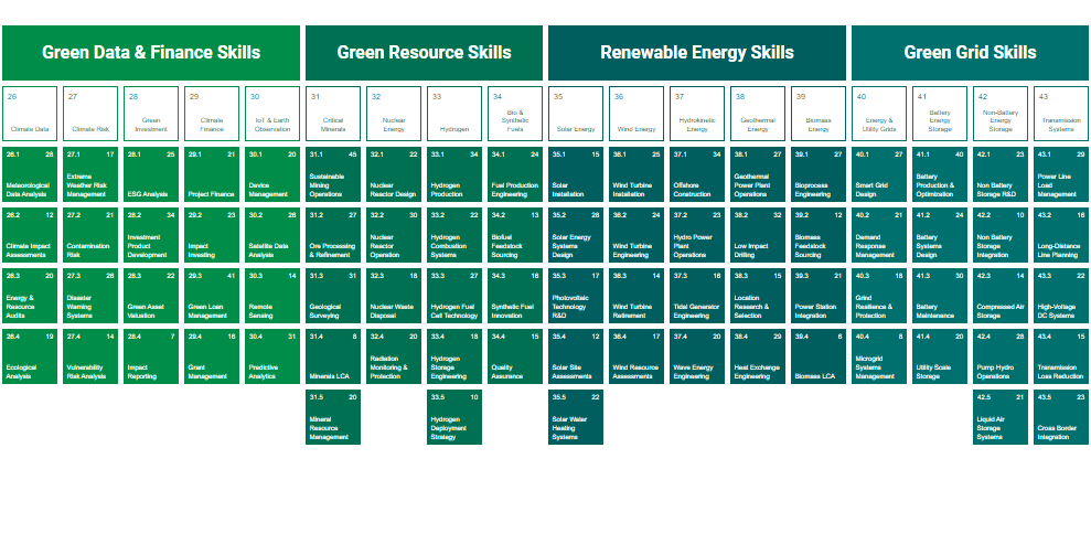 HolonIQ has launched the Green Skills Map, an open-source framework initiated for cataloging, evaluating, and contextualizing the different components of the rapidly expanding field of green jobs. This comprehensive taxonomy will serve as a resource for understanding the full spectrum and complexity of green skills required across various sectors, thereby enabling a cohesive approach toward achieving net zero and decarbonizing the global economy. Green Skills Map spans 11 areas, 54 sub-areas, and 243 green skills clusters. A snippet of the map covering four areas has been included above. Explore the full map on greenskills.org.