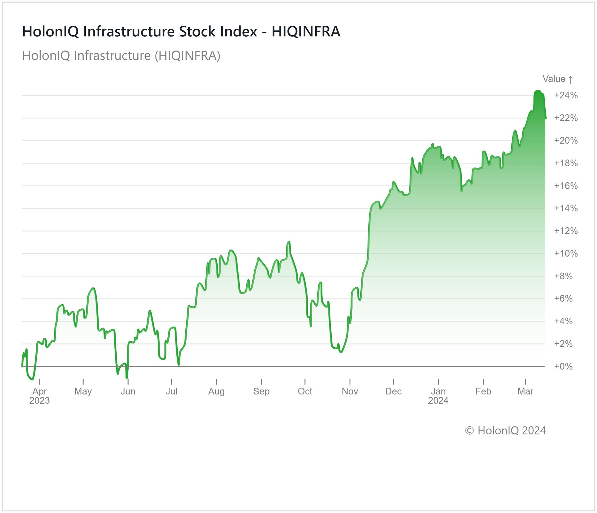 HolonIQ's Infrastructure Index grew 23% over the past year, driven by companies operating railways. Major stocks in the index, including Union Pacific Corp ($149B MCap), Canadian Pacific Kansas City ($84B MCap), and CSX Corp ($72B MCap), demonstrated gains of 29%, 10%, and 27%, respectively.