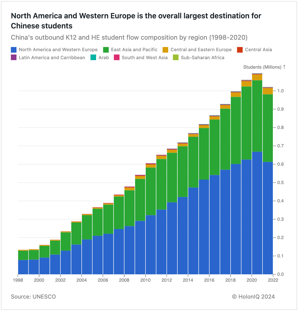 Over the past two decades (1998-2020), China's outbound K12 and higher education student flow composition has shown an increase in students heading to North America, Europe, and Asia-Pacific regions. With the biggest market being the US, China's students going to the US surged from 10% in 2000 to nearly 35% pre-pandemic.