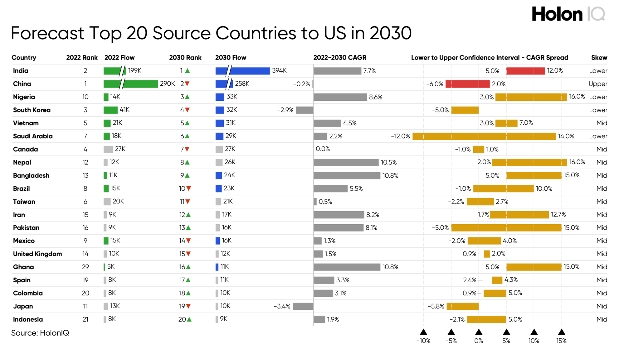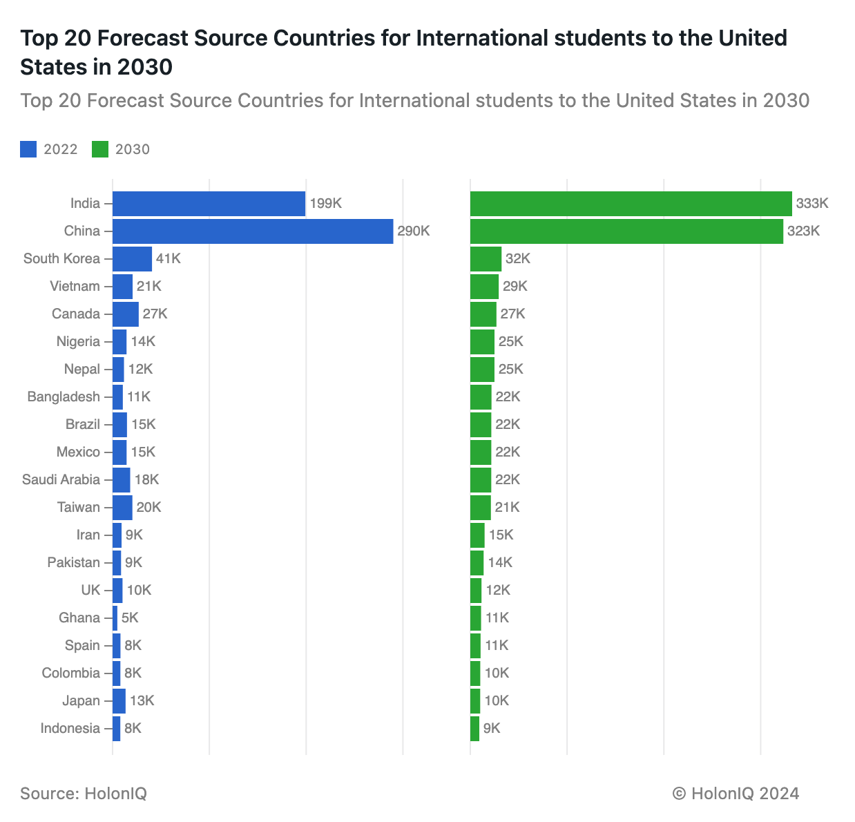 Since 2018, HolonIQ's Global Student Flows Project has forecasted international student flows at higher education institutions worldwide, guiding institutional strategy and policy. With a post-pandemic resurgence, the project now offers detailed forecasts and analysis, starting with the United States, based advanced forecasting models and expert interviews.