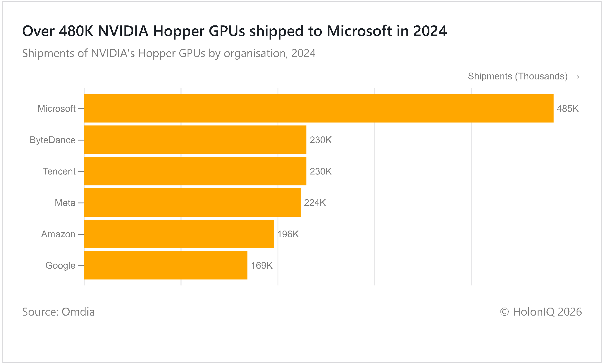 Microsoft leads global purchases of Nvidia Hopper AI accelerator chips in 2024 with 485K units, more than double the next buyers, ByteDance and Tencent. The high volume reflects Microsoft’s investment in AI cloud infrastructure and large-scale AI model training. Such purchases highlight the growing strategic importance of AI hardware for computing and services. The US CHIPS and Science Act implemented by the US Government supports domestic semiconductor production and advanced AI hardware development.