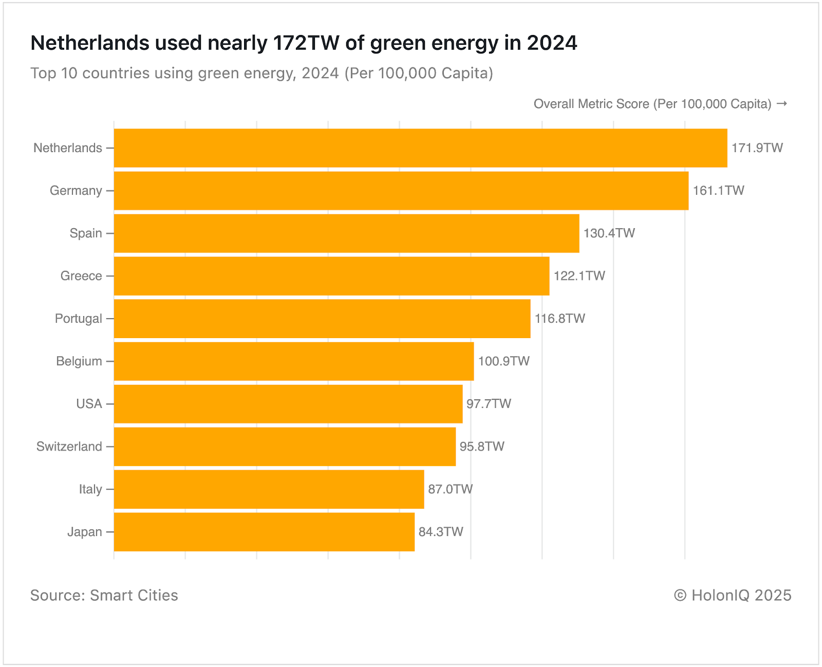 The Netherlands leads global green energy consumption at nearly 172TW, followed by Germany and Spain. The data shows a strong European dominance, reflecting consistent regional investment in renewable grids and offshore wind. Outside Europe, the US and Japan trail amid policy shifts toward clean technology incentives. The EU Green Deal and REPowerEU plan continue driving the region’s renewable transition.