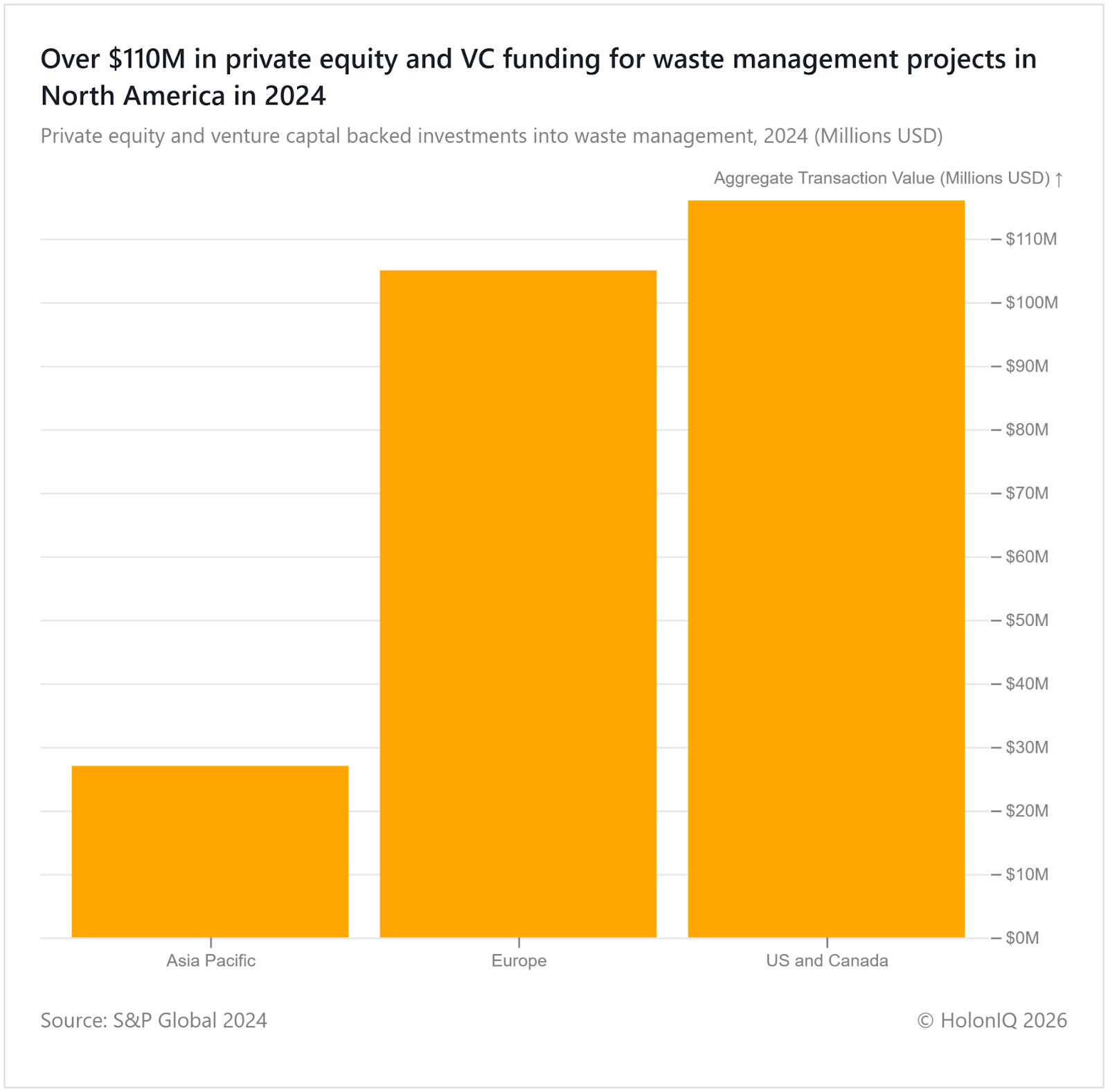 Global VC interest in waste management reflects a focus on startups leveraging AI and robotics to solve environmental crises. North America led with a majority market share, while Europe faced a relative financing gap for late-stage scaling. Conversely, the APAC region generates a large share of global waste but suffers from record-low private investment and proper disposal mechanisms. This disparity stems from varying regulatory maturity, institutional capital availability, and more established exit pathways in Western markets compared to emerging economies.