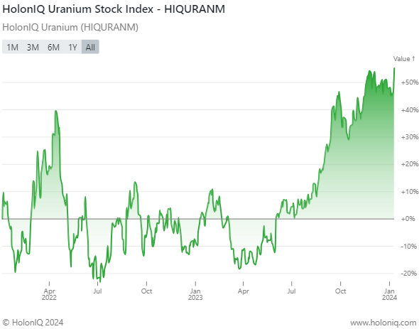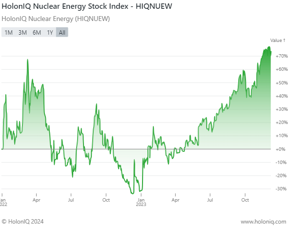 HolonIQ's Nuclear and Uranium indices cover close to 100 of the best-performing stocks in the market and are actively monitoring the global economy and its impact on our indexes. The Nuclear and the Uranium Industries are closely interlinked and the performance of one has an immediate and direct impact on the other. Thus, we look at both parallelly to gauge how the market is performing.