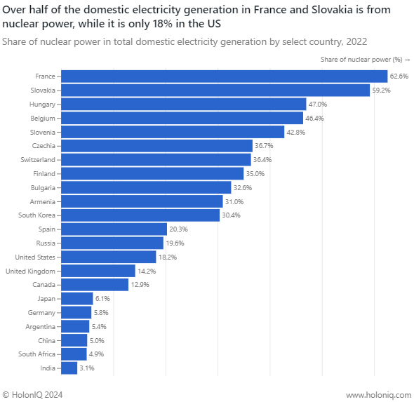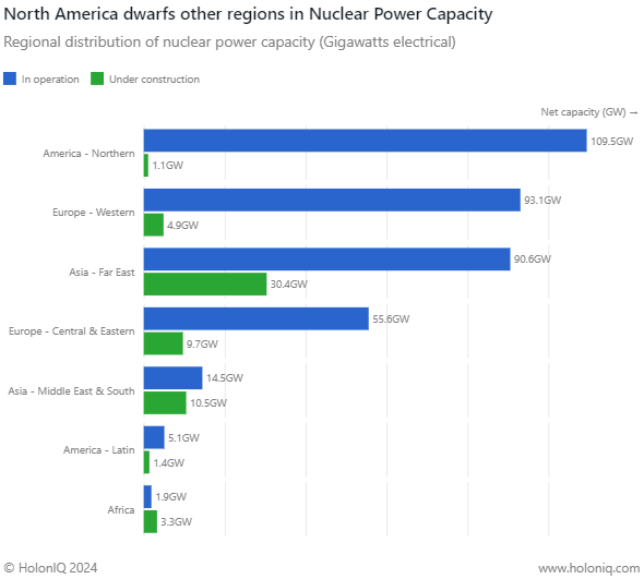 Despite France generating more electricity from nuclear energy, the US leads other regions in nuclear power capacity with over 100GW of capacity in operation. Constellation Energy, Duke Energy, and Tennesee Valley Authority account for the largest capacity in the US. A mixture of historical factors such as the partial meltdown of a reactor in Pennsylvania and the Chernobyl incidents have turned public sentiment away from Nuclear energy in the US, coupled with the country's reliance on fossil fuels has kept them from fully utilizing its nuclear fleet. East Asia, led by China has the largest nuclear capacity under construction with 21 reactors, looking to increase their total capacity to 45 reactors.