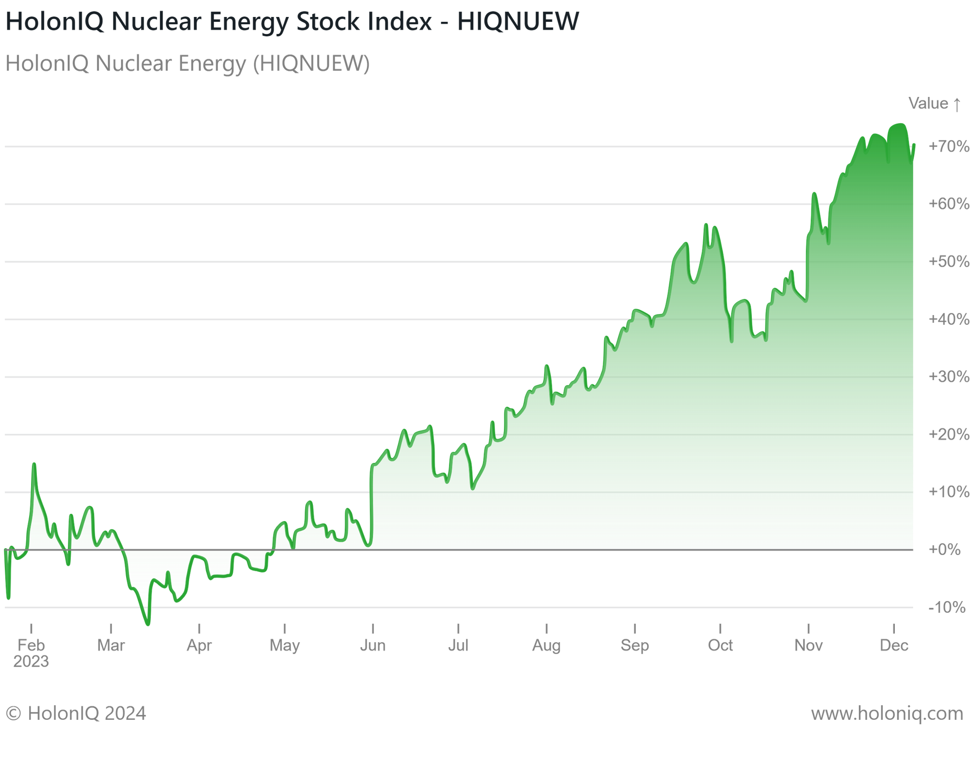 HolonIQ Nuclear Index (HIQNUEW). 12-month Indexed returns (returns on the index relative to the level on 23rd Jan 2023 over the last 12 months) trended upwards throughout the period. Year-on-Year returns stand at an impressive 70% in January 2024.
