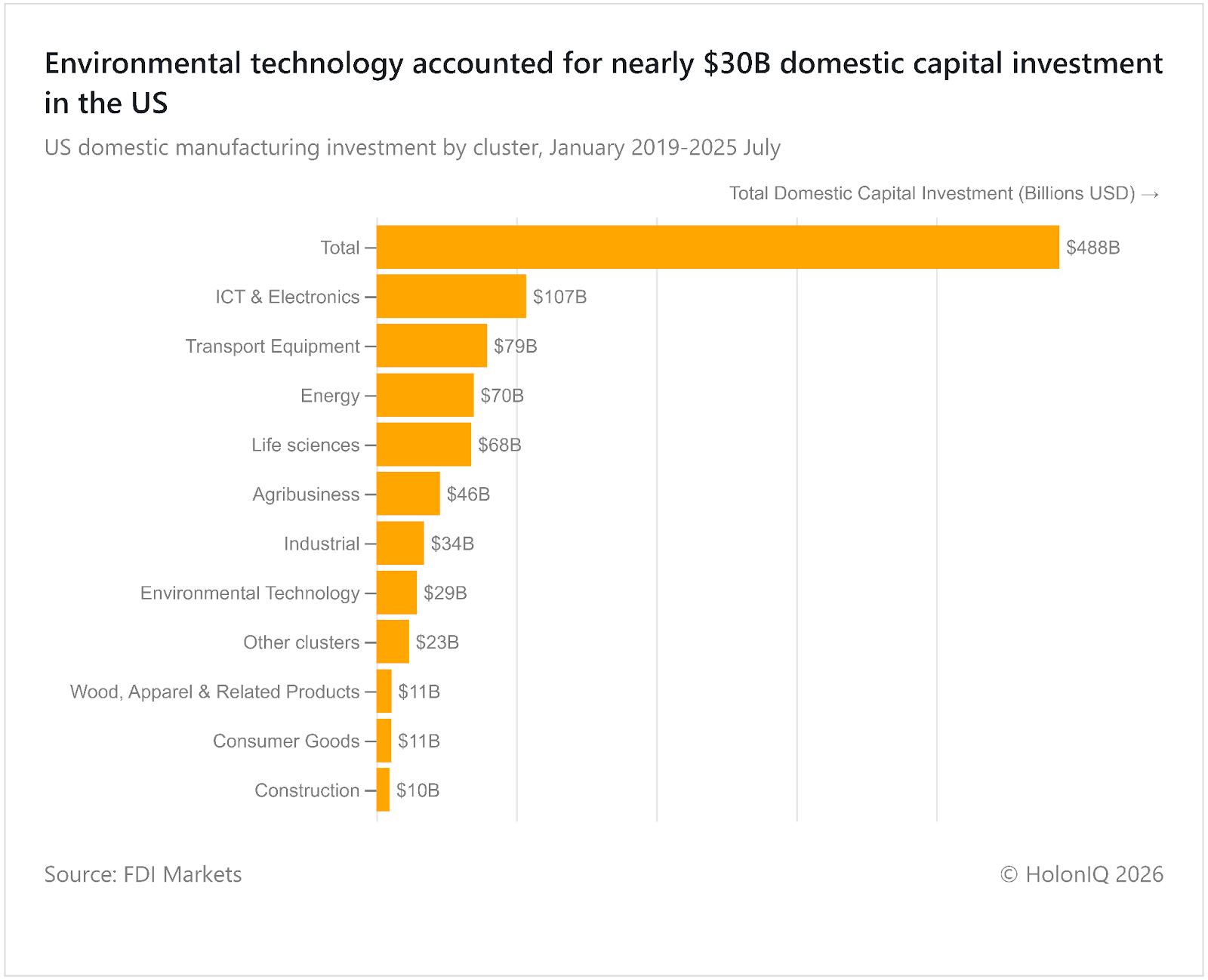 Environmental technology attracted nearly $30B in investment in the US. Green industries remain undercapitalised despite rising climate targets. Advanced manufacturing is closely tied to this sector by producing batteries, precision sensors, and clean energy systems, which require high-tech fabrication capacity. As countries scale net zero strategies, industrial policy and green incentives will increasingly channel capital toward environmentally focused manufacturing ecosystems.