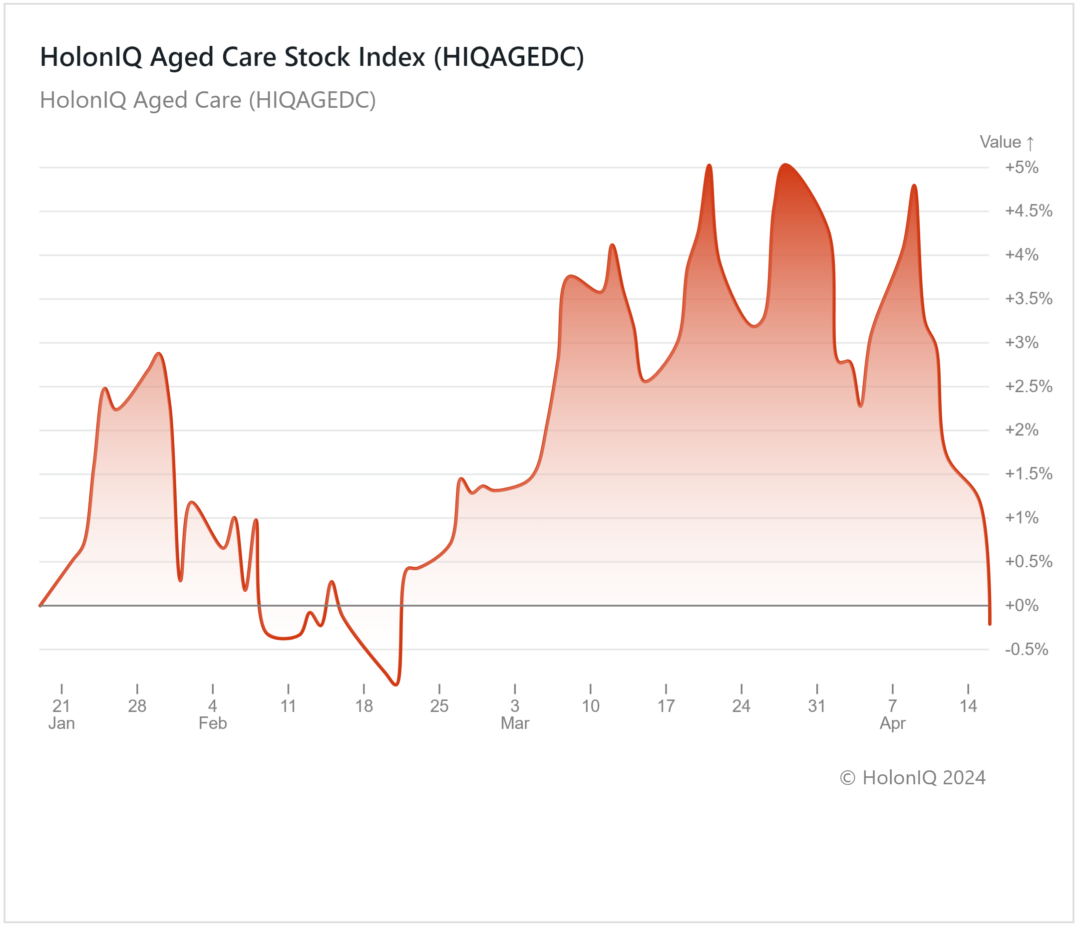HolonIQ's Aged Care index stagnated after a March high of 5%, mirroring its performance from three months prior. Key stocks like Welltower OP LLC rose 4%, while Sonova Holding AG and Ventas, Inc. fell 3% and 14%, respectively. The sector confronts a pressing challenge: a globally aging population. By 2030, 1 in 6 people is projected to be over 60, signifying a substantial forthcoming demand for aged care services. The sector exhibited promising performance in March due to year-on-year enrollment improvements. Further growth for the index might be aided by key player expansions in 2024, such as Encompass' planned six new facilities. However, persistent challenges—staffing shortages, funding limitations, and regulatory hurdles—impede industry progress. Enrollment rate improvements may decelerate or stagnate, potentially slowing future index performance.
