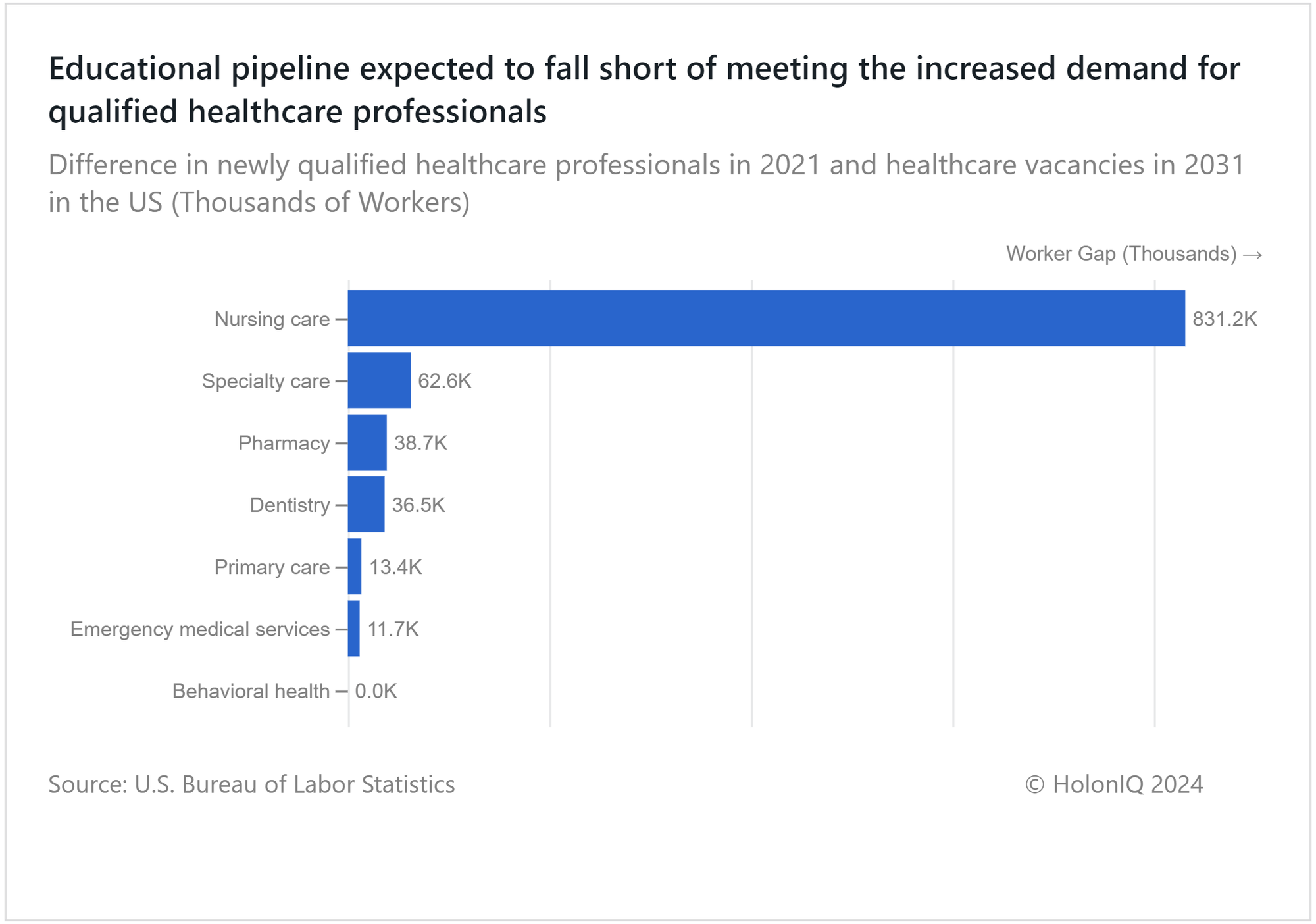 There is a widening gap between qualified healthcare professionals and job vacancies in the US, highlighting the urgent need for support and education to meet evolving market demands and enable specialization. Projections reveal significant deficits, especially in nursing, with an 831,212 professional gap, and in specialty care, with a shortfall of 62,604 professionals by 2031 compared to 2021.