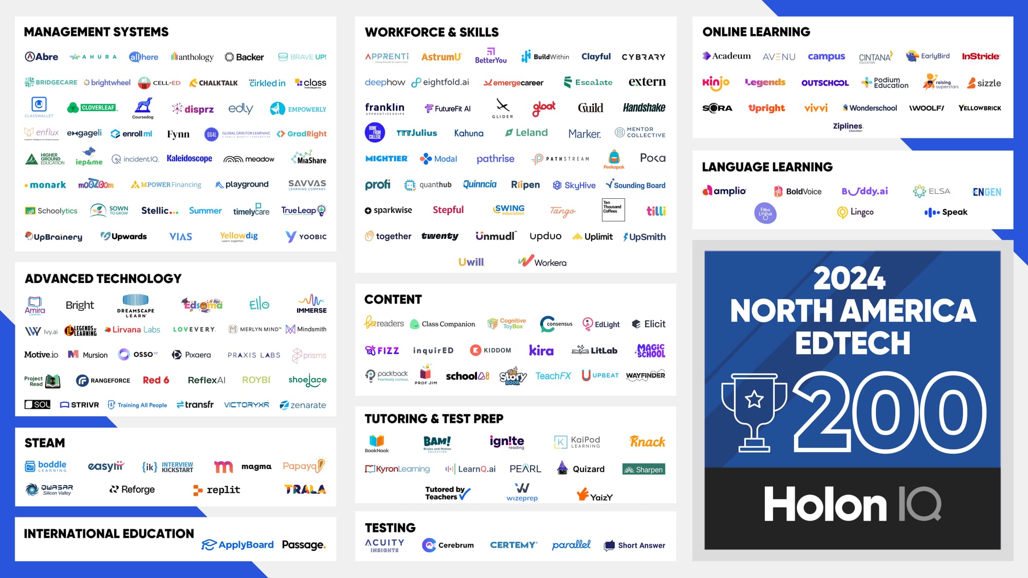 Management systems along with workforce and skills are the two largest categories in this year's list, with learning environments and financing education dominating in management systems, whilst workforce and skills sees significant diversity in solutions, ranging from workforce and career planning to upskilling and mentoring. A focus on skills is evident with skills mapping, matching, and skills intelligence solutions seeking to support companies as they identify and train internal talent. Learn more about the makeup of the 2024 North America EdTech 200, and download the market map. Customers can deep dive the data on the HolonIQ platform.