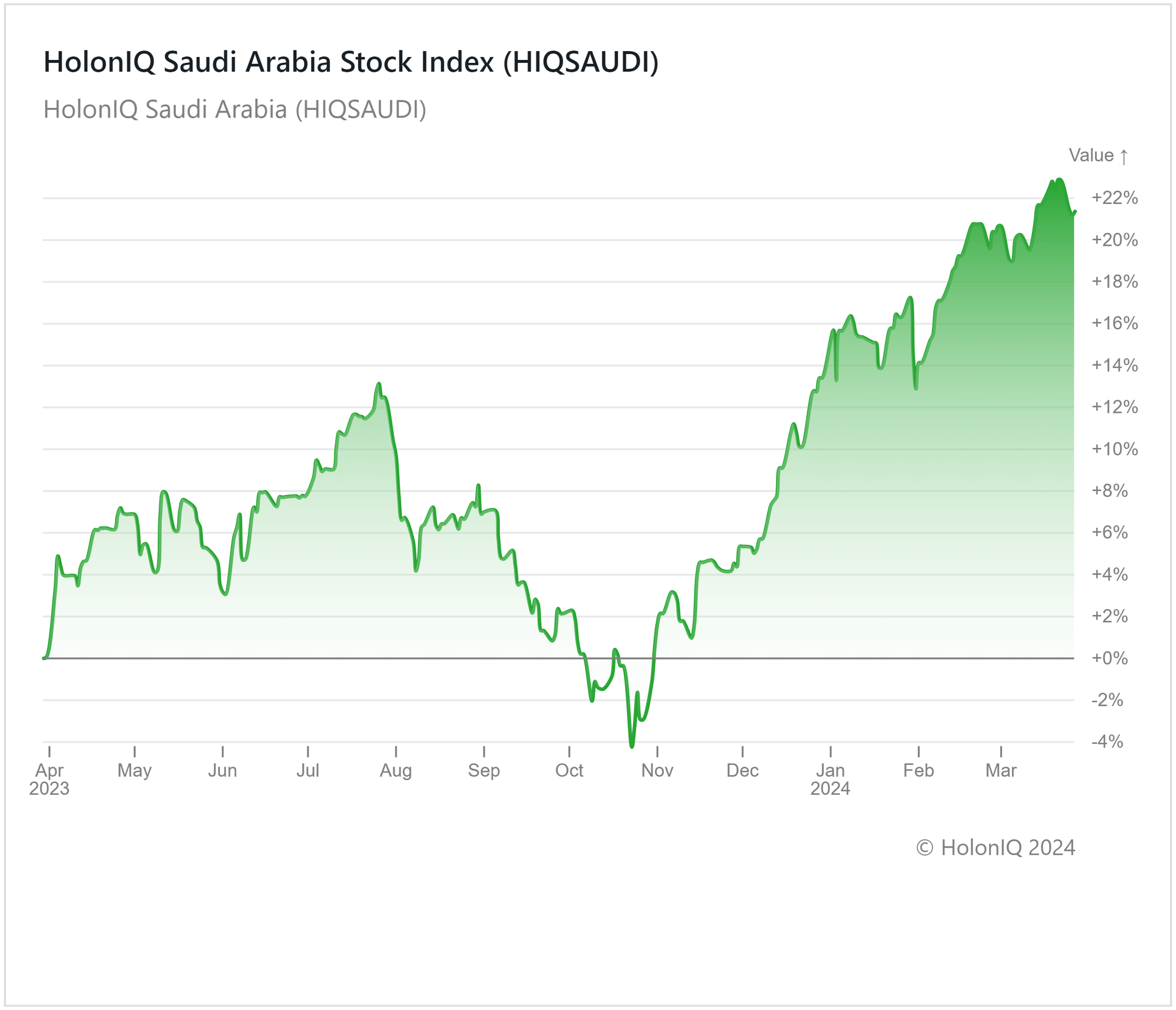 Despite a slowdown in Saudi Arabia's GDP in 2023 due to observed oil supply cuts, HolonIQ's Saudi Arabia index has increased by 19%. Major stocks within the index also increased. ACWA Power Co ($66B MCap) displayed an increase of 143%, while Saudi National Bank ($65B MCap) and Al Rajhi Bank ($89B MCap) saw a 21% and 16% rise, respectively.