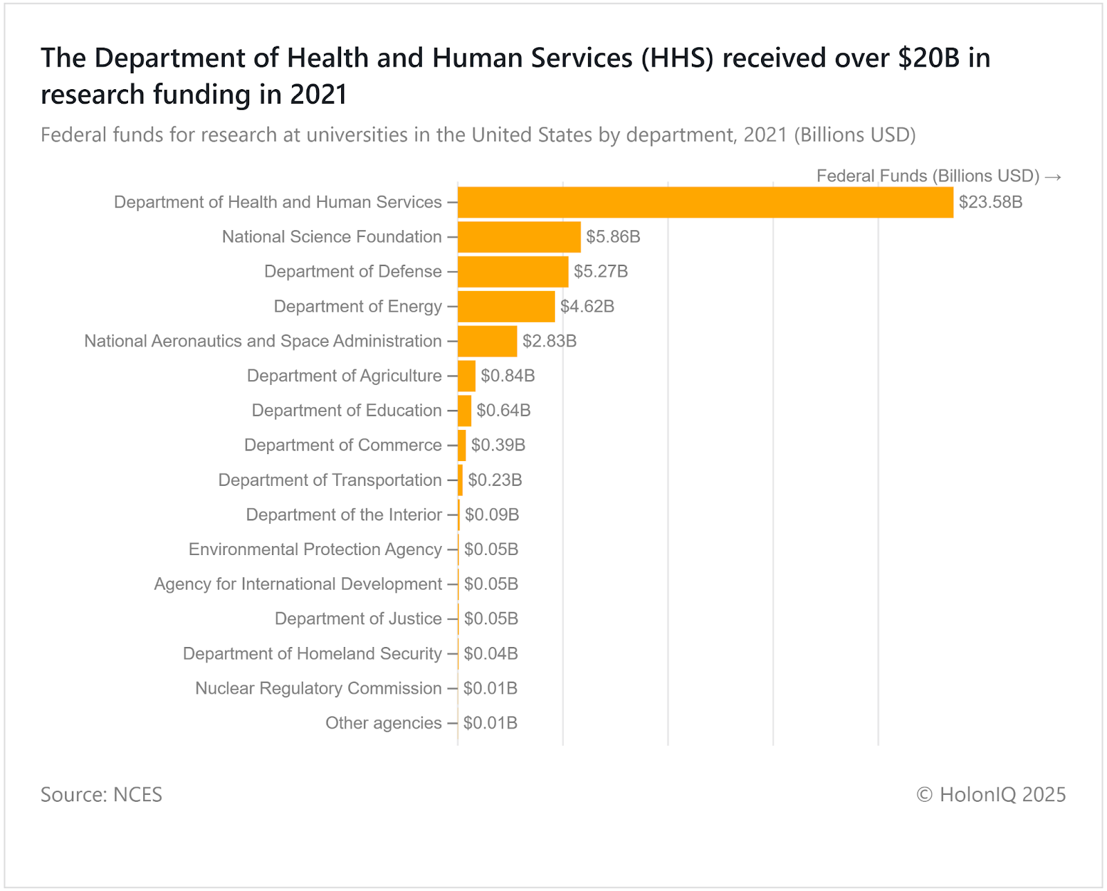 The Department of Health and Human Services dominated federal research funding to universities in 2021 with $23.58B, representing over 26% of total allocations. The National Science Foundation, with $5.86B and the Department of Defense, with $5.27B ranked second and third. Combined, the top three agencies accounted for approximately 39% of university research funding. As the pandemic called for increased research capacity in the health sector, the latest government policies, such as funding cuts and technological advancements in AI, will alter the funding dynamics.