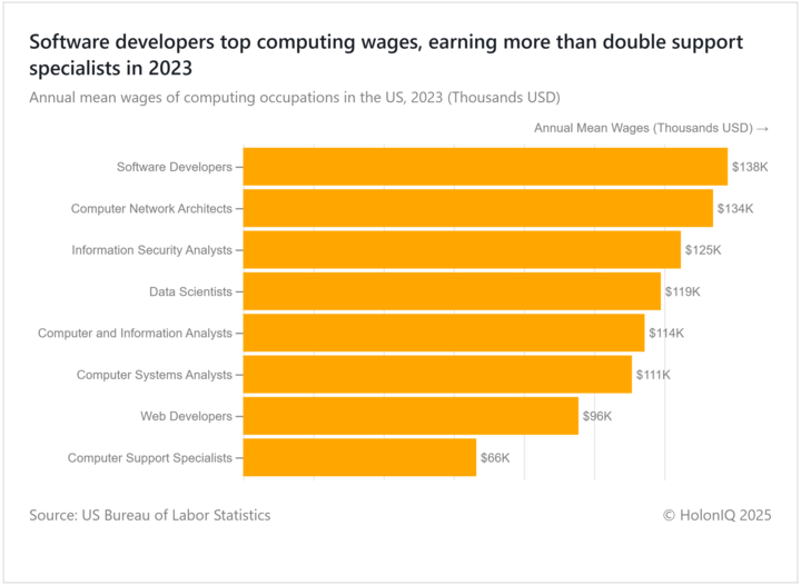 Software developers average $138K, while support specialists earn $66K. The higher earnings for roles such as network architects and information security analysts highlight the rising demand for advanced technical skills amid growth in cybersecurity and AI. Apprenticeship programs could expand access to high-demand technical jobs in sectors like computing. This trend mirrors broader workforce shifts toward digital resilience and innovation. The Department of Labor’s National Apprenticeship Act supports talent pipelines by funding training programs to meet these accelerating market needs.