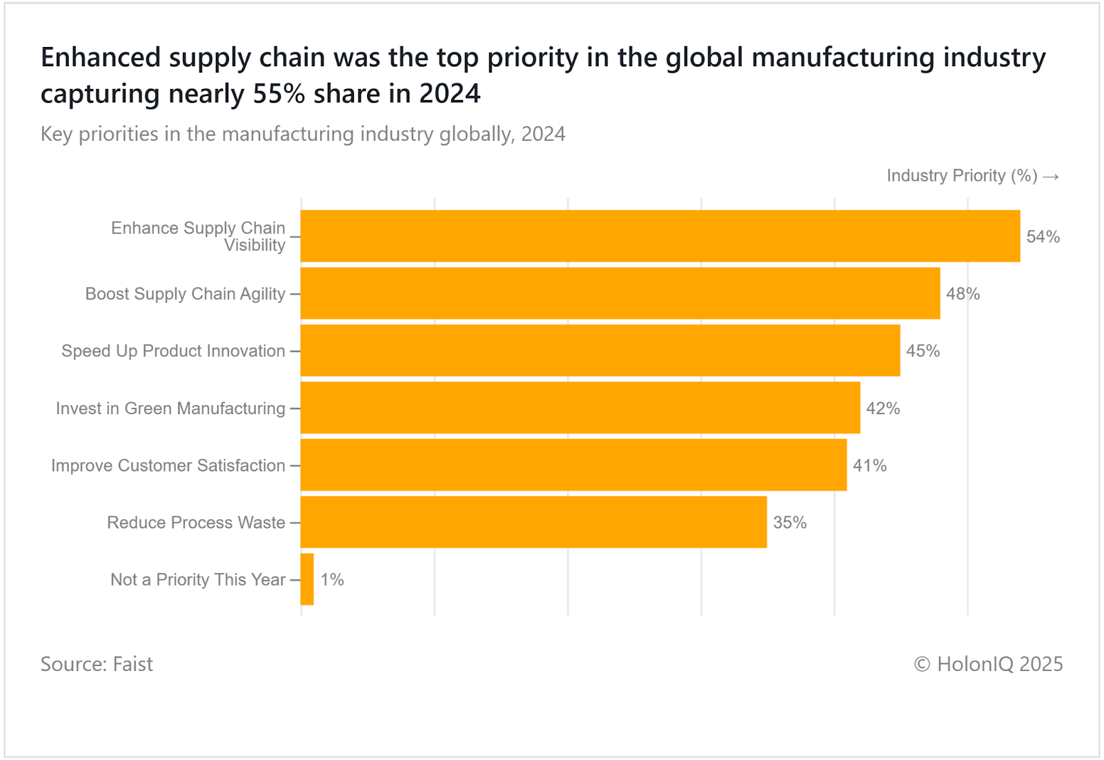 Globally in 2024, manufacturing firms prioritized enhancing supply chain visibility, with 55 percent citing it as a top goal, followed by faster product launches and greater supply chain agility.Enhancing supply chain visibility allows manufacturers to track materials and processes more accurately, reducing delays and improving overall operational efficiency. Environmental concerns also gained traction, as many companies are shifting to sustainable alternatives. It highlights how firms are balancing competitiveness with increased focus on sustainability and green practices as advised by the IFRS .