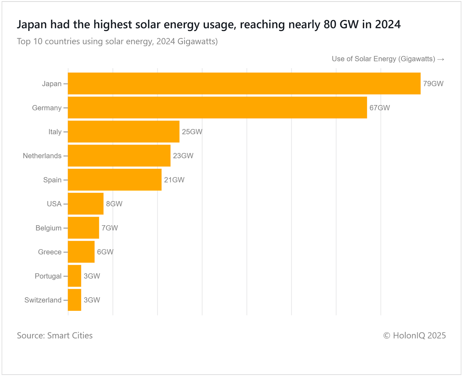 Solar capacity ranges widely across major markets, with Japan leading at nearly 80GW and Germany close behind at 67GW. Switzerlandβs lower output reflects limited land availability and slower permitting for large solar parks. Meanwhile, the Netherlands and Italy are rapidly scaling rooftop systems as installation costs fall. These patterns align with broader clean energy investment momentum. Expansion is guided by national renewable deployment targets administered by energy ministries.