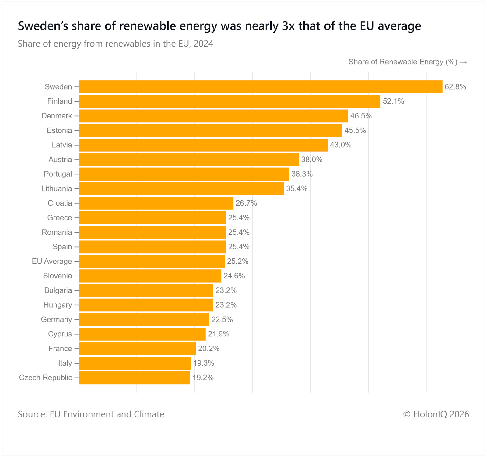 Swedenβs renewable share in 2024 was nearly three times that of the EU average, which reflects decades of investment in hydropower, biomass and wind energy. Strong carbon taxes and early phaseouts of fossil fuels pushed Swedish industries and households toward clean energy. Across the EU, environmental awareness is driven by strict climate laws for sustainability and long-term targets under the European Green Deal. These policies link energy security, economic growth and climate responsibility into one shared strategy.