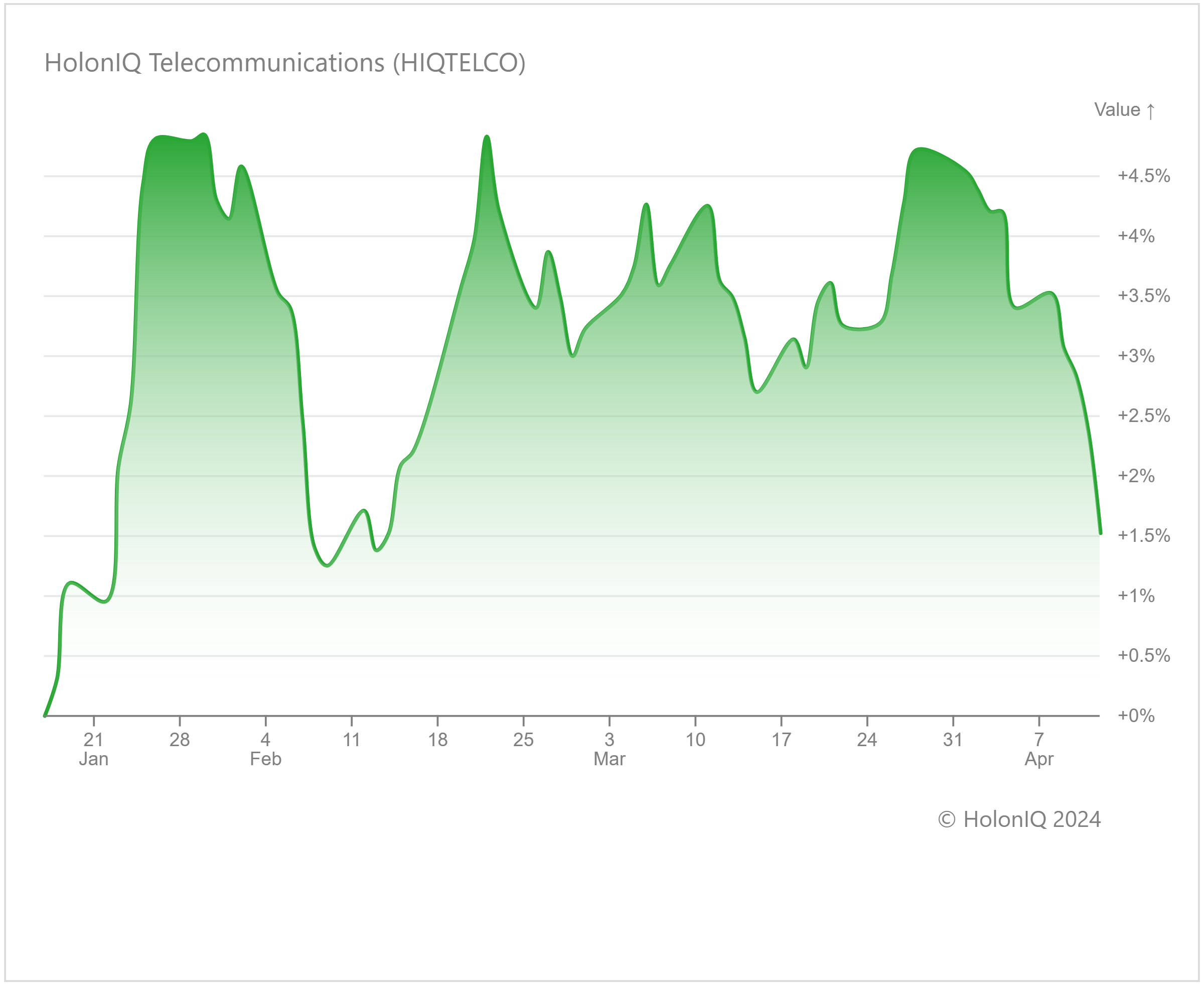 Over the past quarter, the HolonIQ Telecommunication index witnessed fluctuations, reaching highs of around 4.8% in February and March, before settling at a 3-month return of 1.5%. Main stocks in the index such as China Mobile Ltd. ($191B MCap) grew by 4%, while T-Mobile US, Inc. ($189B MCap) and Comcast Corp. ($156B MCap) had more modest increases at 0.8% and 0.1% respectively. With telecom companies generally offering high payout ratios and retaining relatively smaller portions of their income for reinvestment, opportunities for substantial earnings growth may be limited. Underwhelming revenue growth from 5G wireless services is also holding back profit expansion.