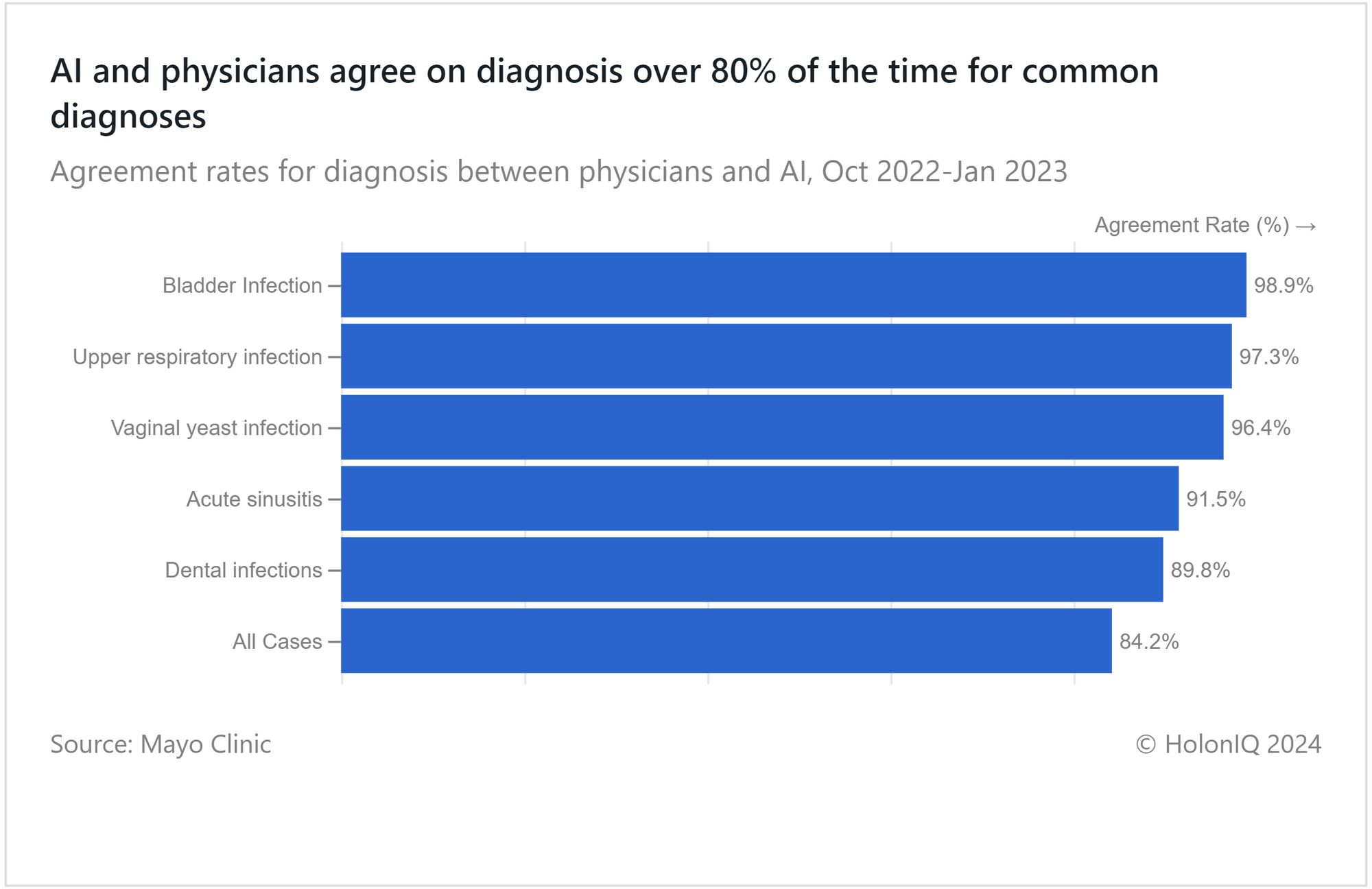 A Mayo Clinic study shows that physicians and AI models agree on over 80% of diagnoses, indicating AI's strong potential as a second opinion in medical diagnosis. Bladder Infections diagnosis had the highest agreement rate of 98.9% indicating a well-specialized model developed. AI can help reduce the medical error rate and the time taken for a diagnosis, the third-leading cause of death in the US, by offering consistent and unbiased evaluations. The time taken for an AI-enabled diagnosis is approximately 44.4 seconds on average while a conventional doctor's diagnosis takes an average time of 3.6 minutes.