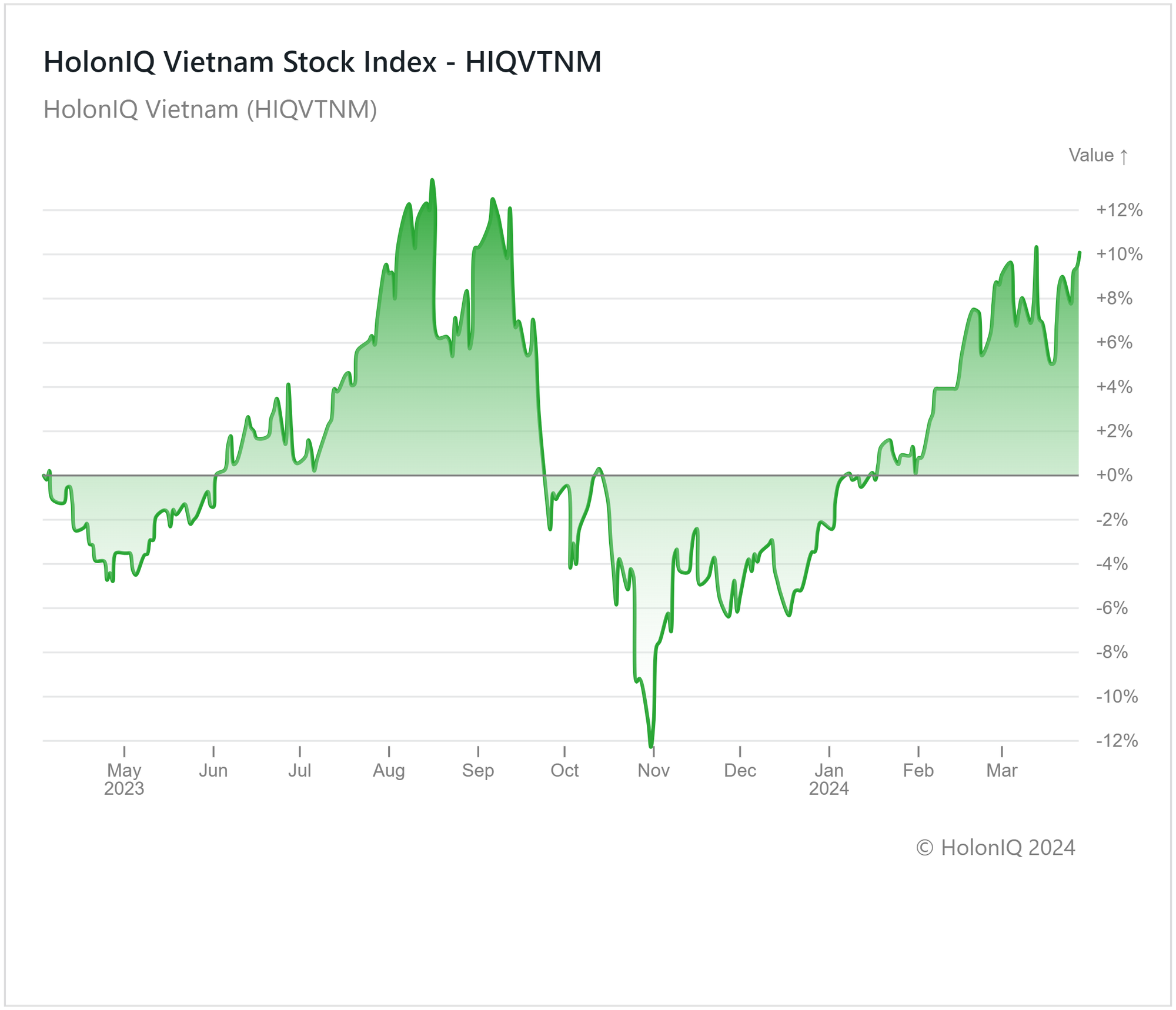 HolonIQโs Vietnam Index grew 10% over the past year after declining 12% in November 2023. Positive performance in the finance sector drove some of this recovery. Capital markets have benefited from rising liquidity, improving valuations, and government policies conducive to improving governance and macroeconomic conditions. The Vietnam Joint Stock Commercial Bank for Industry & Trade ($7.7B MCap) saw 25% annual growth, and Hoa Phat Group ($7.1B MCap) grew by 36%.