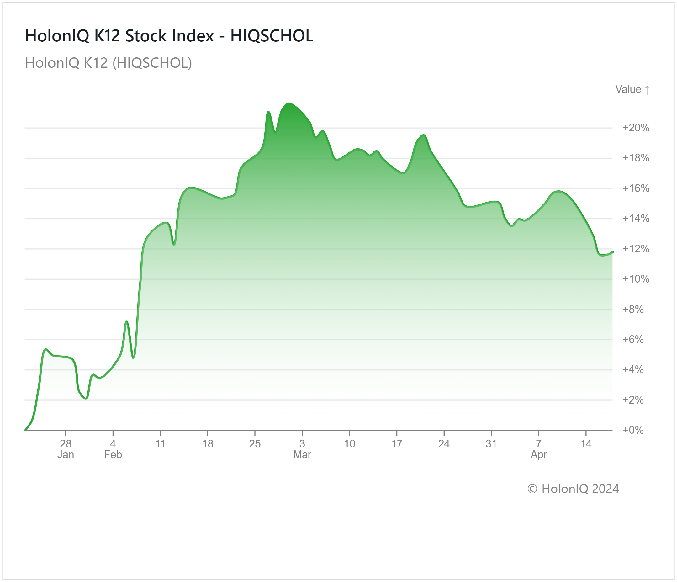 HolonIQ's K12 index has experienced modest growth over the past three months, registering a 10% increase, despite a mixed performance among major stocks in the index. New Oriental Education & Tech Grp ($14B MCap), TAL Education Group ($7B MCap) showed growth of 16%, 4% returns, and Roblox Corp. ($23B MCap) returns have fallen by 5% in the same period.