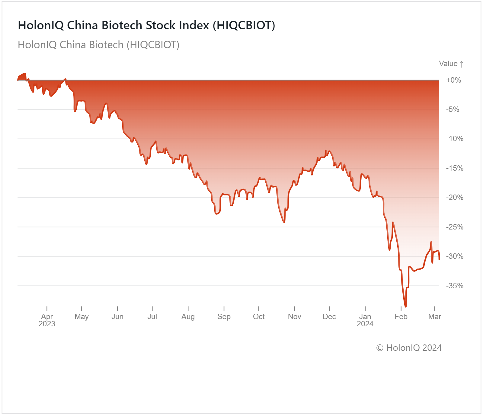 HolonIQ's China Biotech Index has declined by about 30% over the past year after reaching lows of 40% in February. Major stocks in the index have fallen over the last 12 months, including WuXi AppTec Co ($23B MCap), BeiGene ($18B MCap), and Chongqing Zhifei Biological Products ($17B MCap).