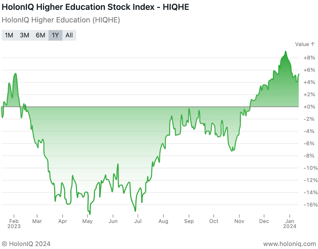 HolonIQ tracks over 300 listed education companies and has the most comprehensive coverage of education acquisitions and investments. We powered the world's first Education Technology ETF and soon we launch a range of Stock Indices to track the daily performance of early Childhood, K12, EdTech, Tutoring and Test Prep and Higher Education companies worldwide.