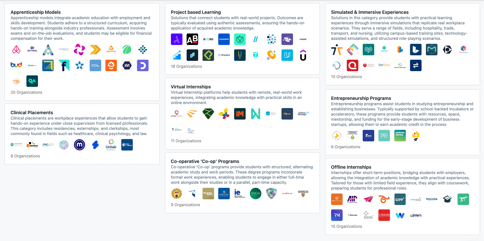 Work-Integrated Learning combines academic studies with practical work experiences, allowing students to gain hands-on experience in a professional setting. This structured approach addresses both educational and workplace requirements, complementing traditional classroom learning with real-world application. Diverse models of WIL, including project-based activities (Practera, Crio.Do), simulated experiences (InSimu, Pixaera), and internships (Forage, InternMatch, Riipen), link students to real-world projects, simulate workplace scenarios, and offer practical exposure. Cooperative programs, clinical placements, and apprenticeships (Apprentify, Apprentigo) enhance the integration of academic study with more formal job positions, cultivating industry-specific skills and experience. Catch up on HolonIQ's most recent "The Rise of Skills, Competencies & Degree-Level Apprenticeships" Webinar for more insights on the work integrated learning.